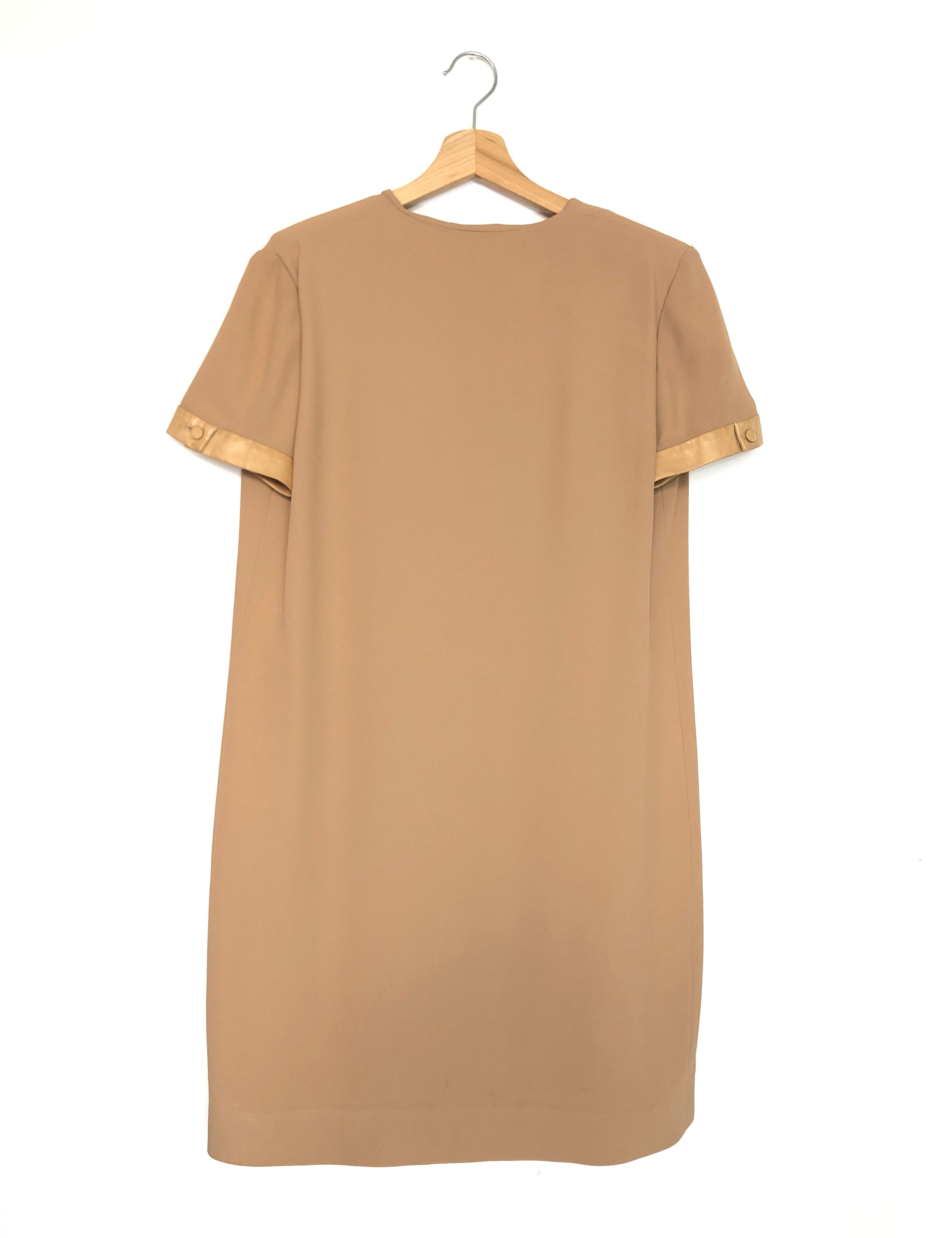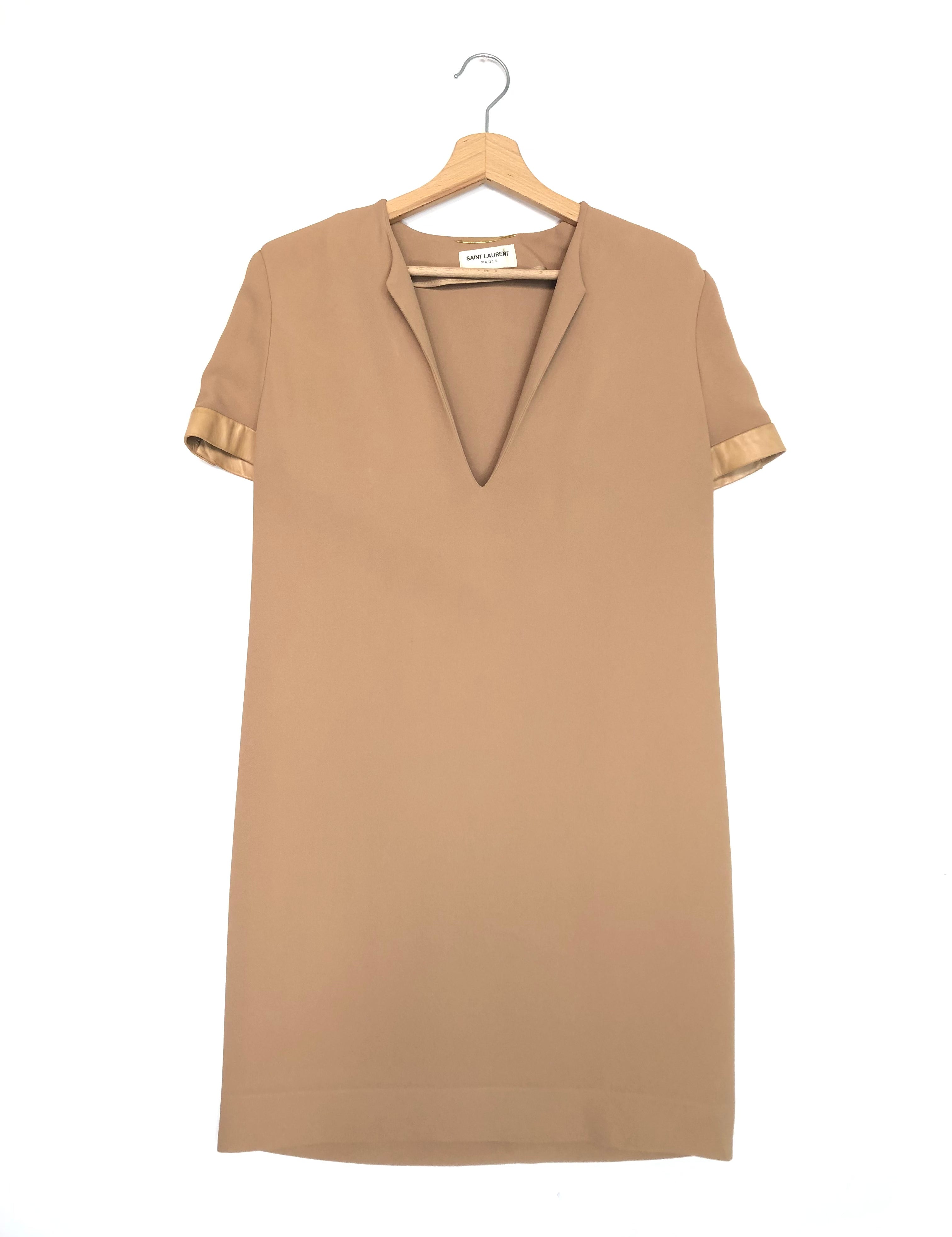 Dark Beige Short Sleeve with Leather Yokes Midi Dress / SAINT LAURENT - Size 42