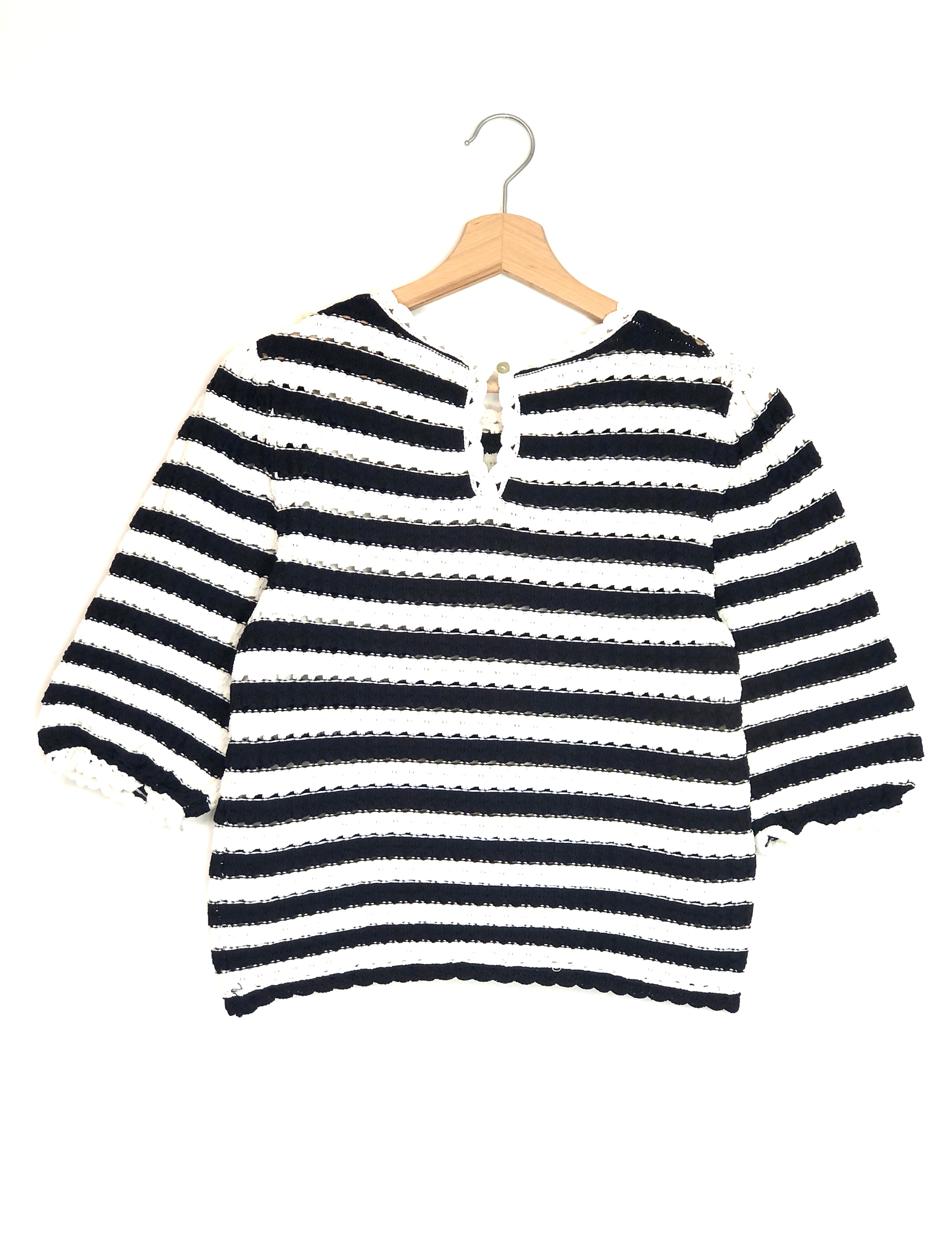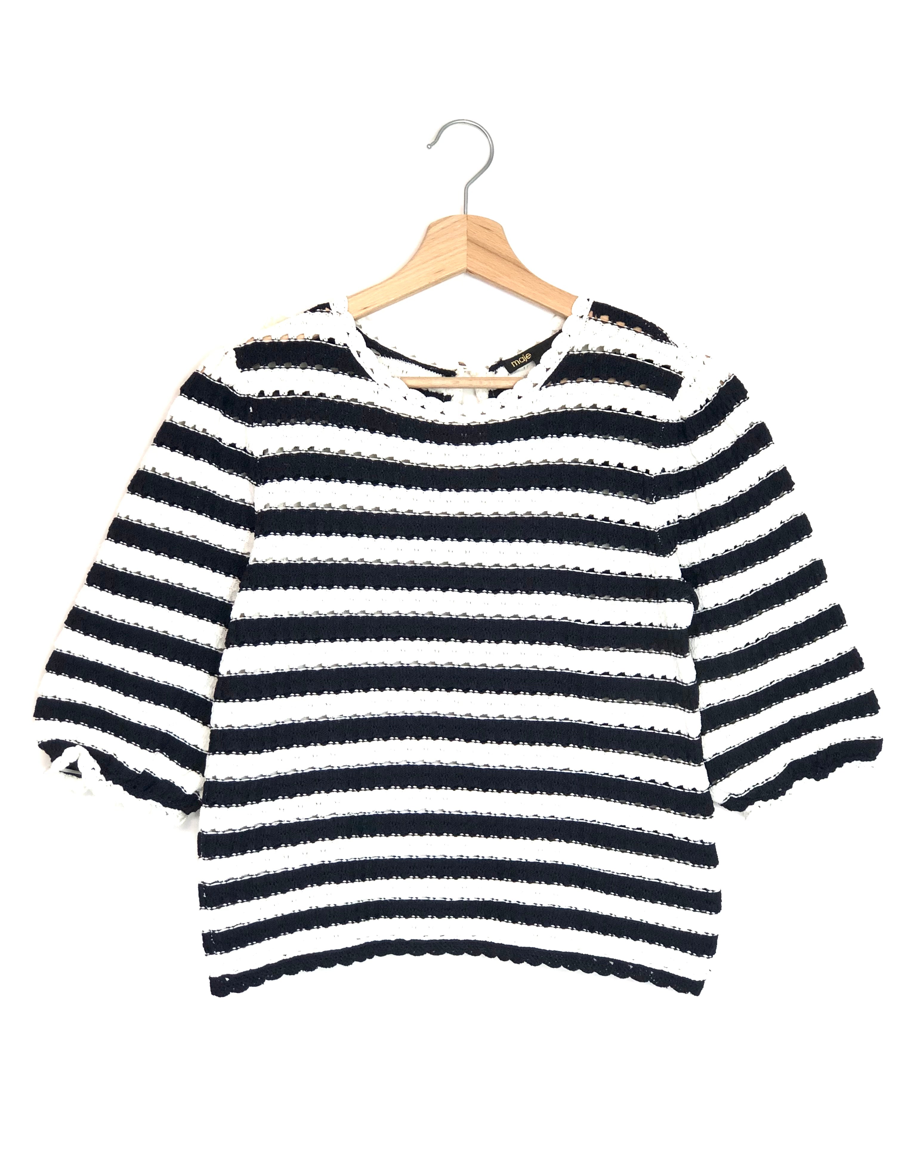 Dark Blue and White Striped Crochet-effect Short Sleeves Jumper / MAJE - Size 1
