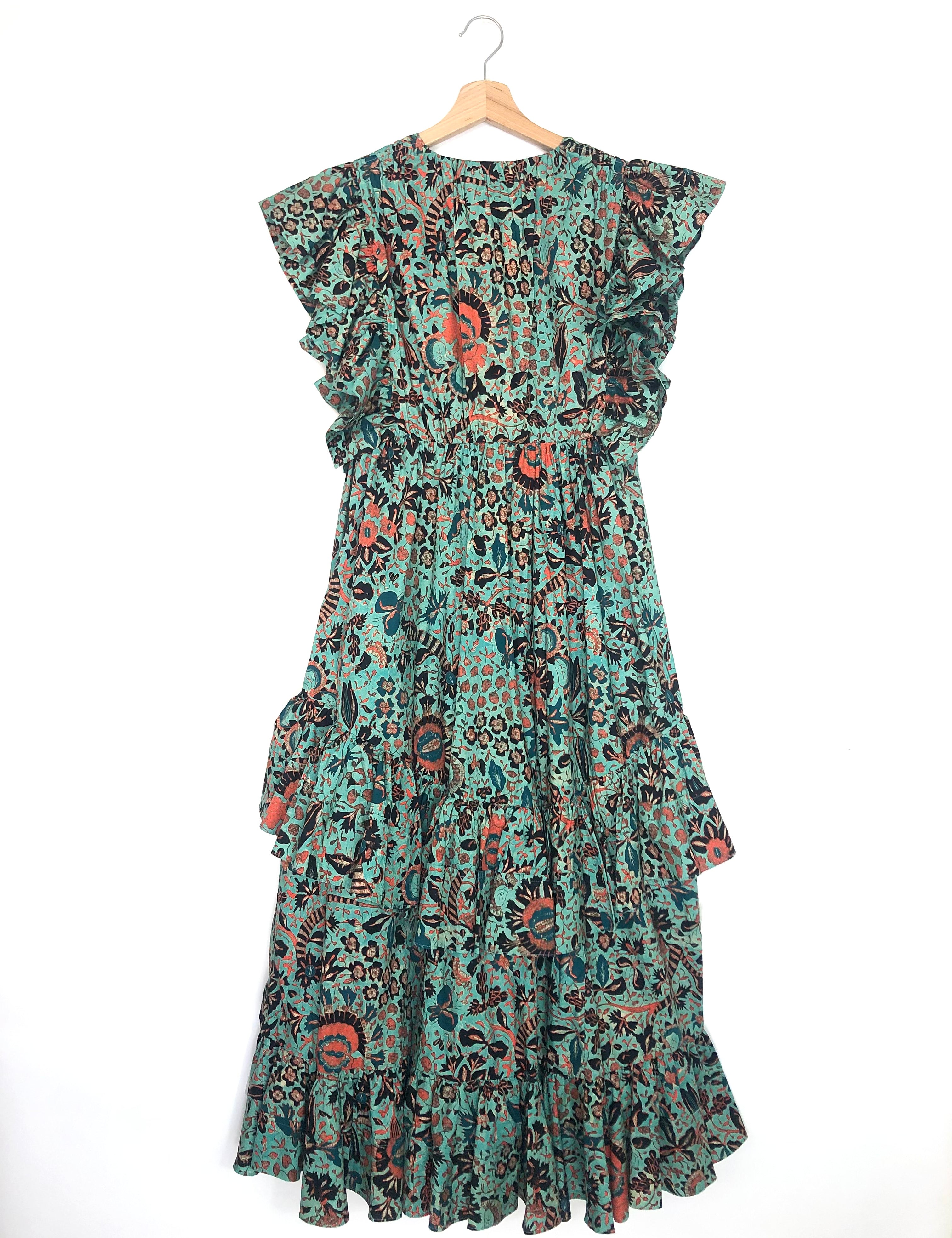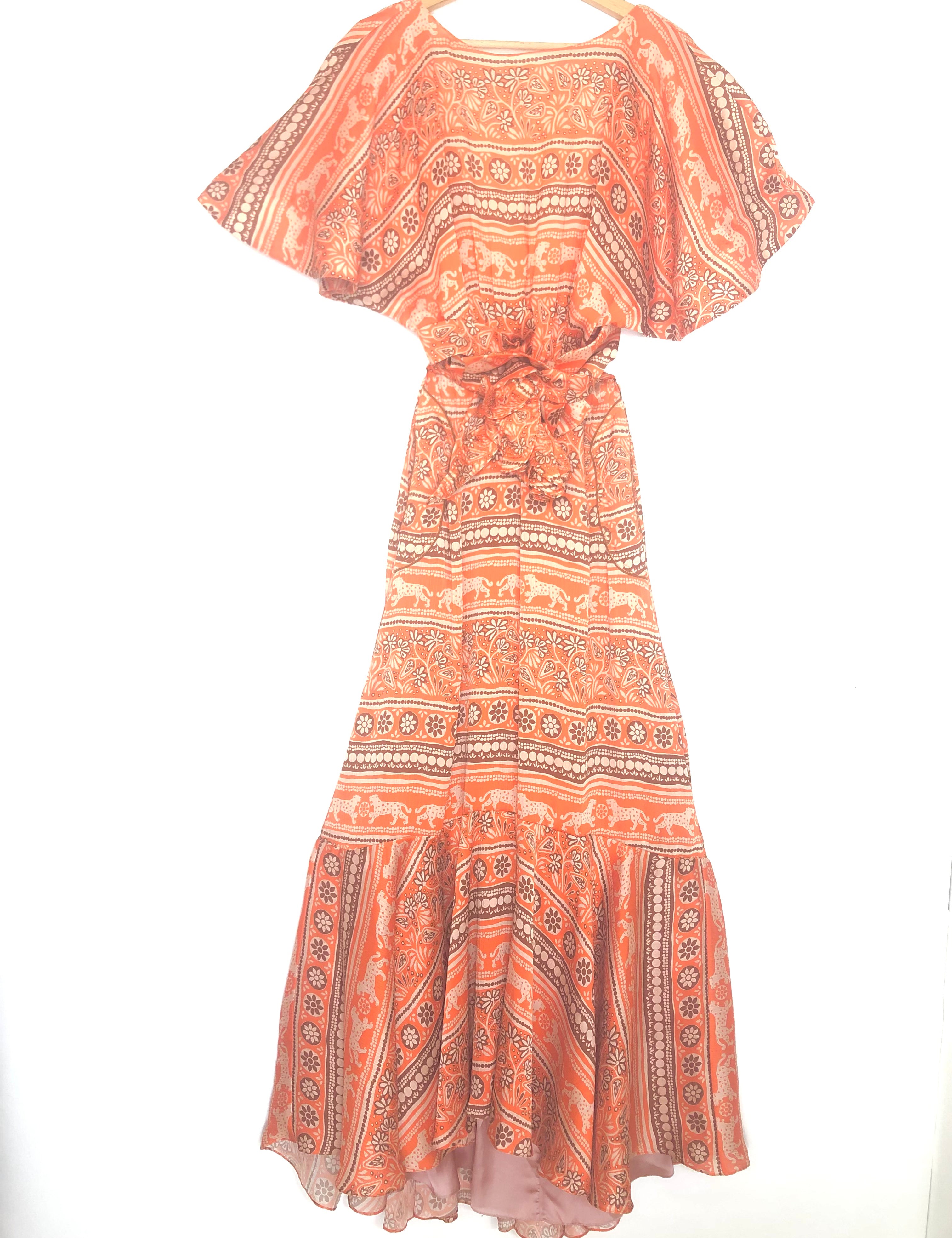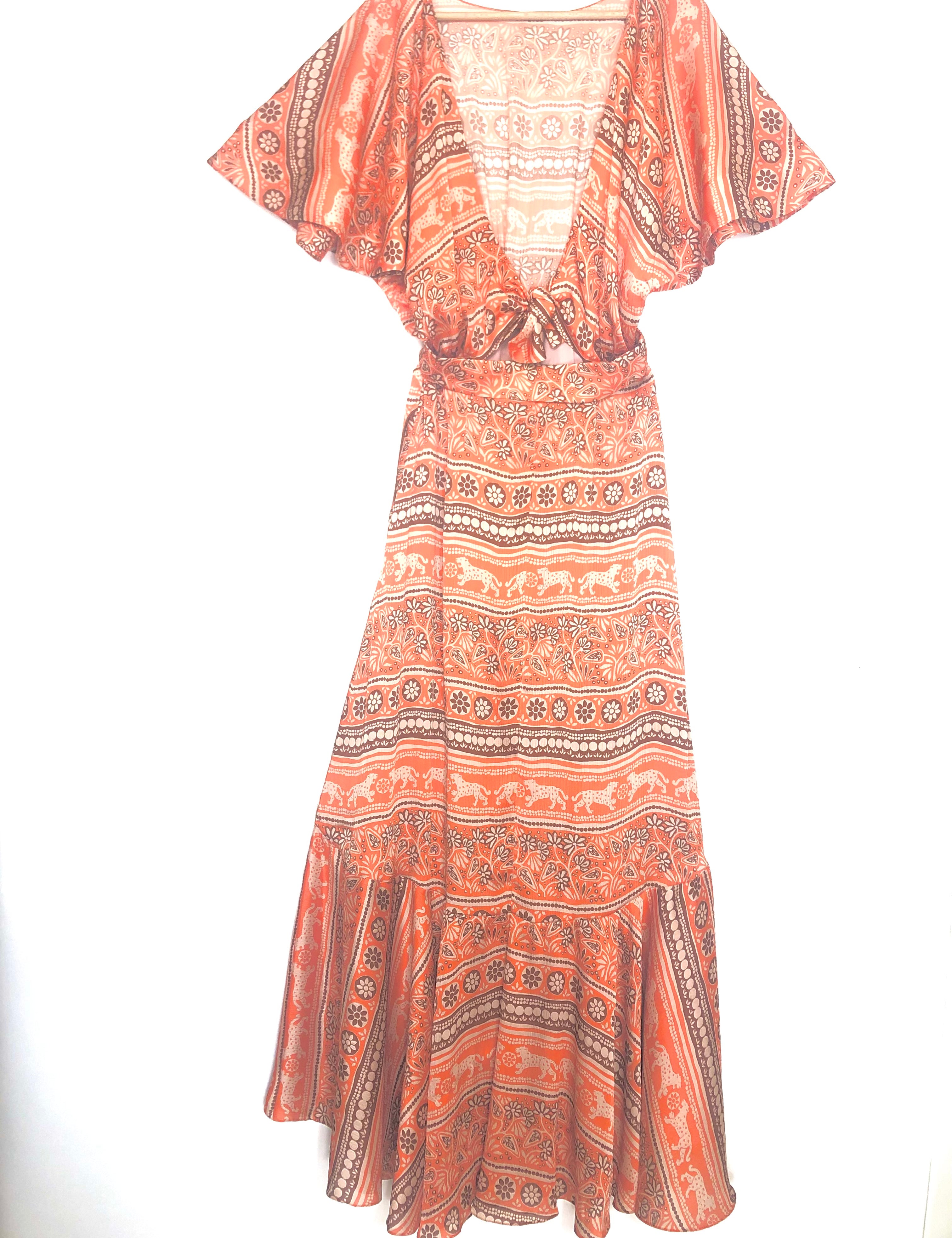Monk Orange Printed Front Tie Ruffled Maxi Dress / JOHANNA ORTIZ - Size US 4