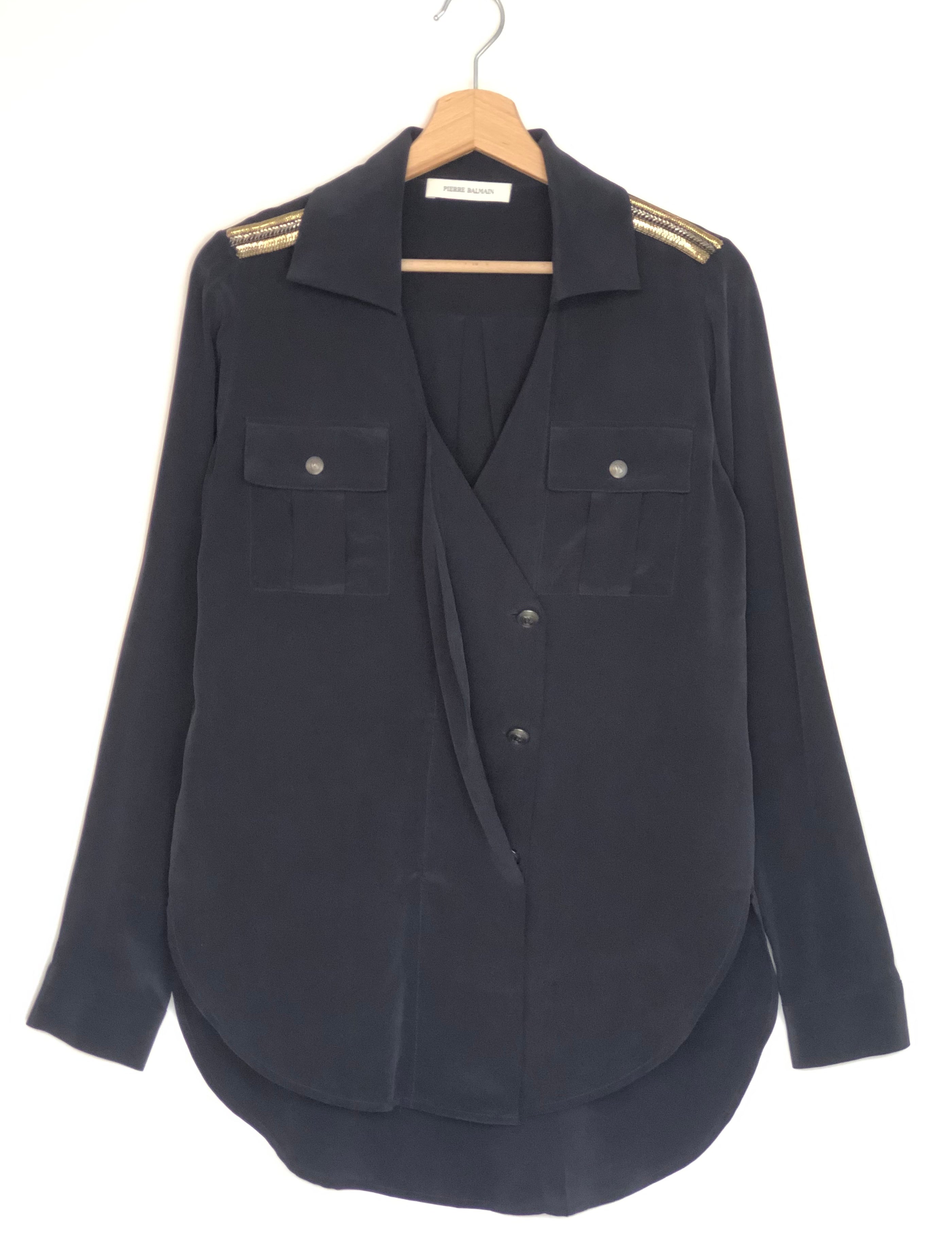 Black Gold Embellished Shoulder Silk Shirt / PIERRE BALMAIN - Size 34