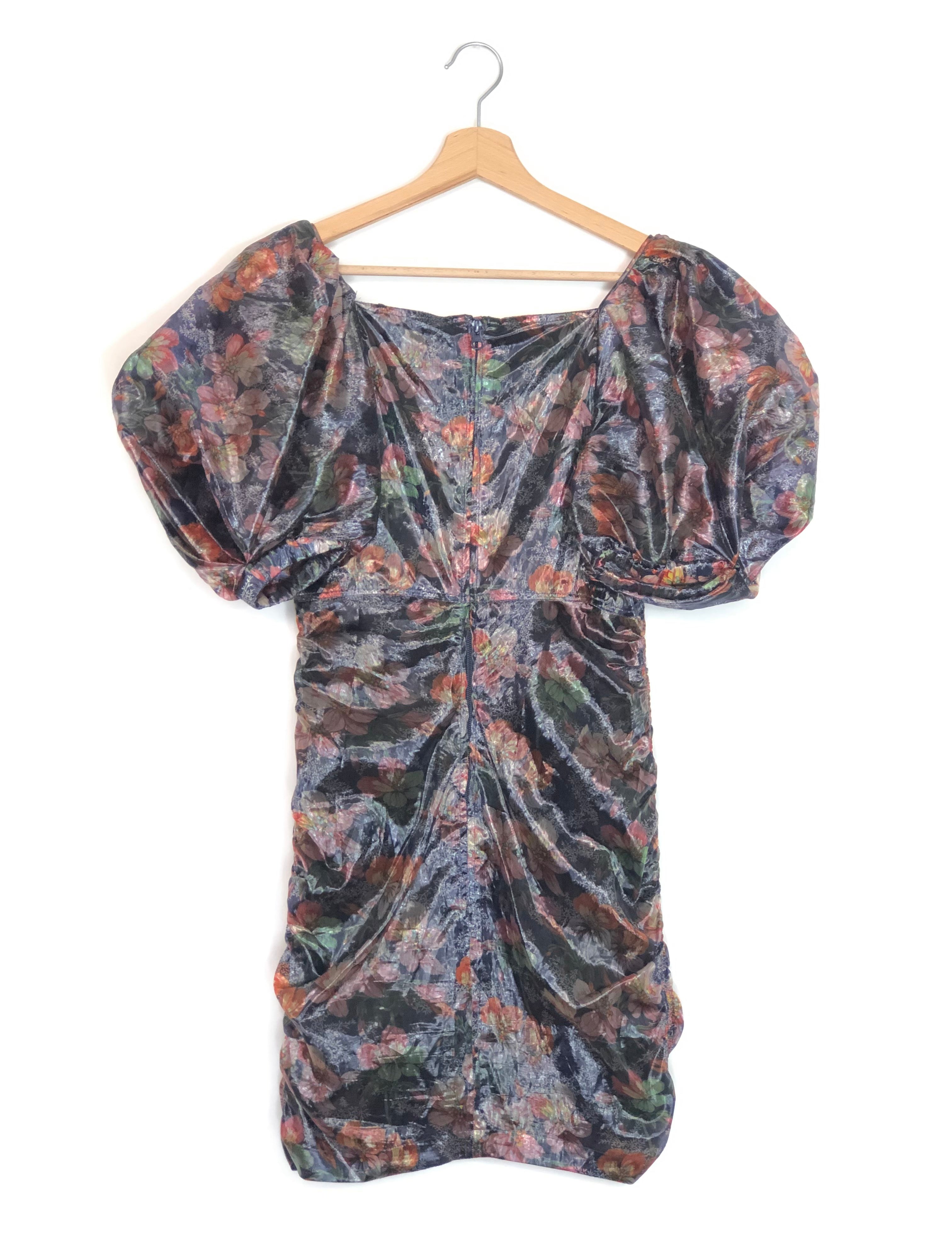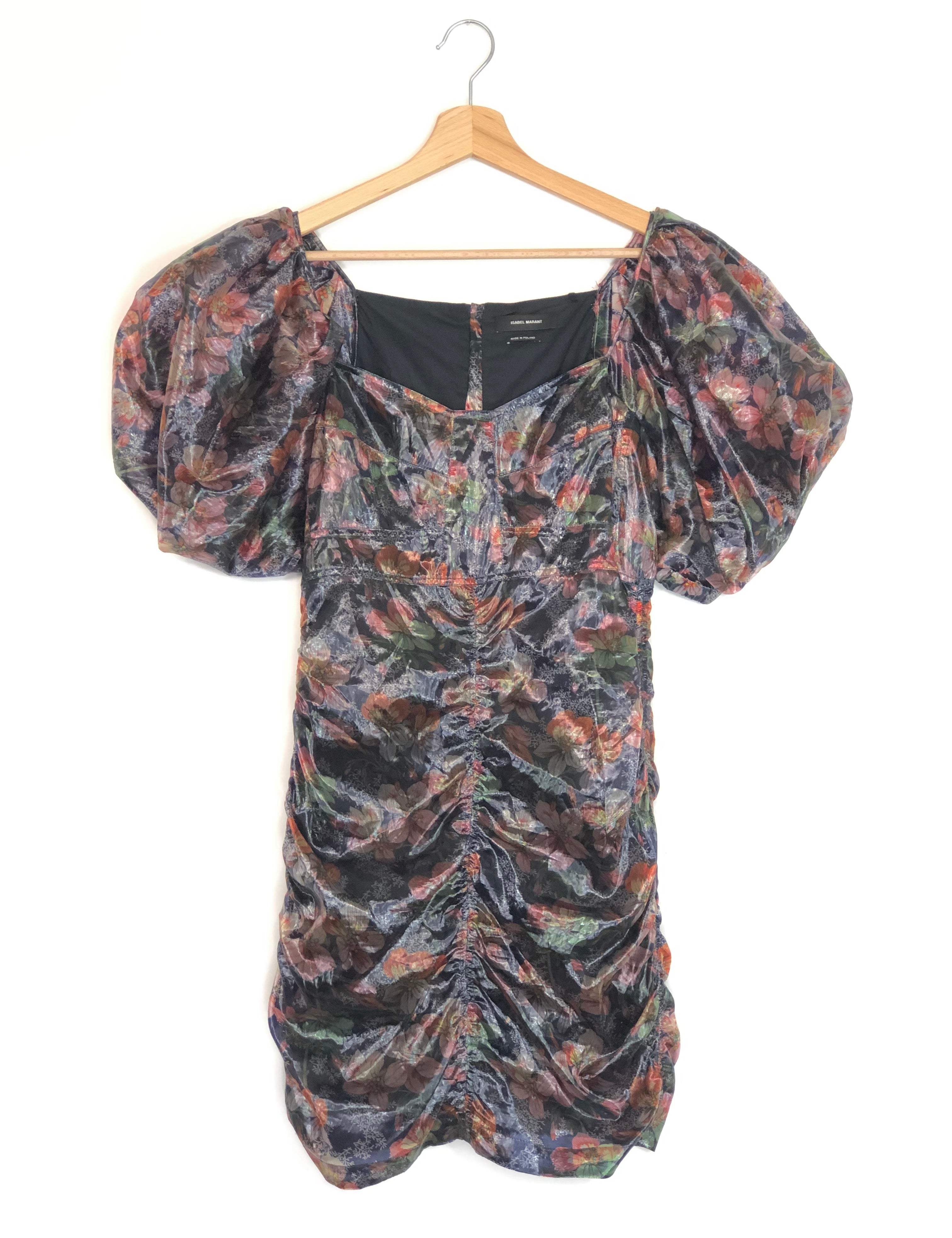 Metallic Navy OXALIS Floral Print Puff Sleeved Dress / ISABEL MARANT - Size 38