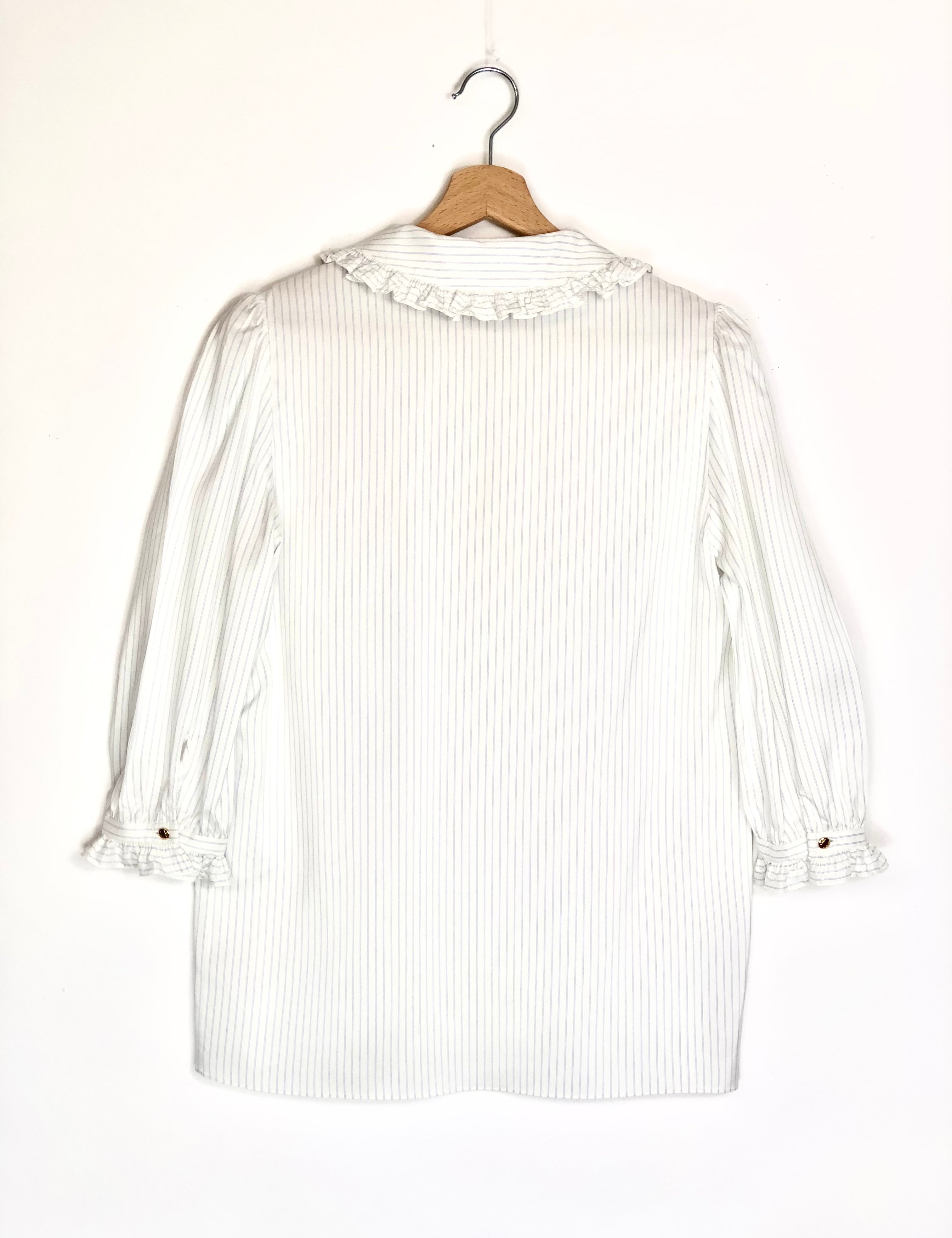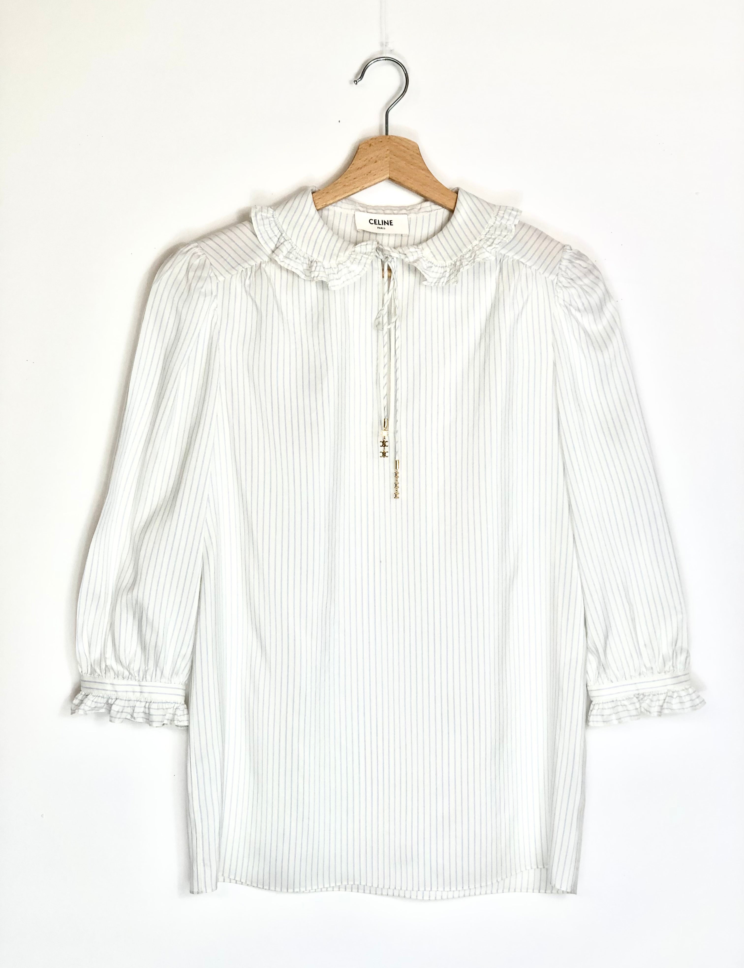 White Striped Ruffled Silk Long Sleeves Shirt / CELINE - Size 36