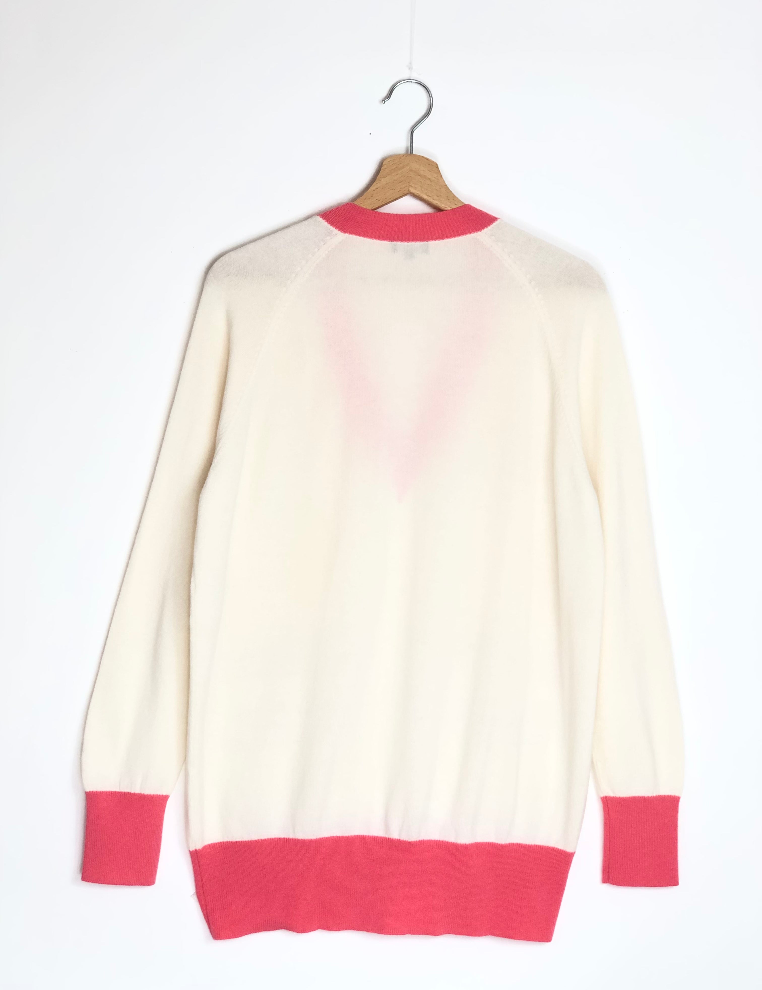 Ecru/Pink Ribbed V-neck 1986-1988 Logo Cashmere Cardigan / CHANEL - Size 38