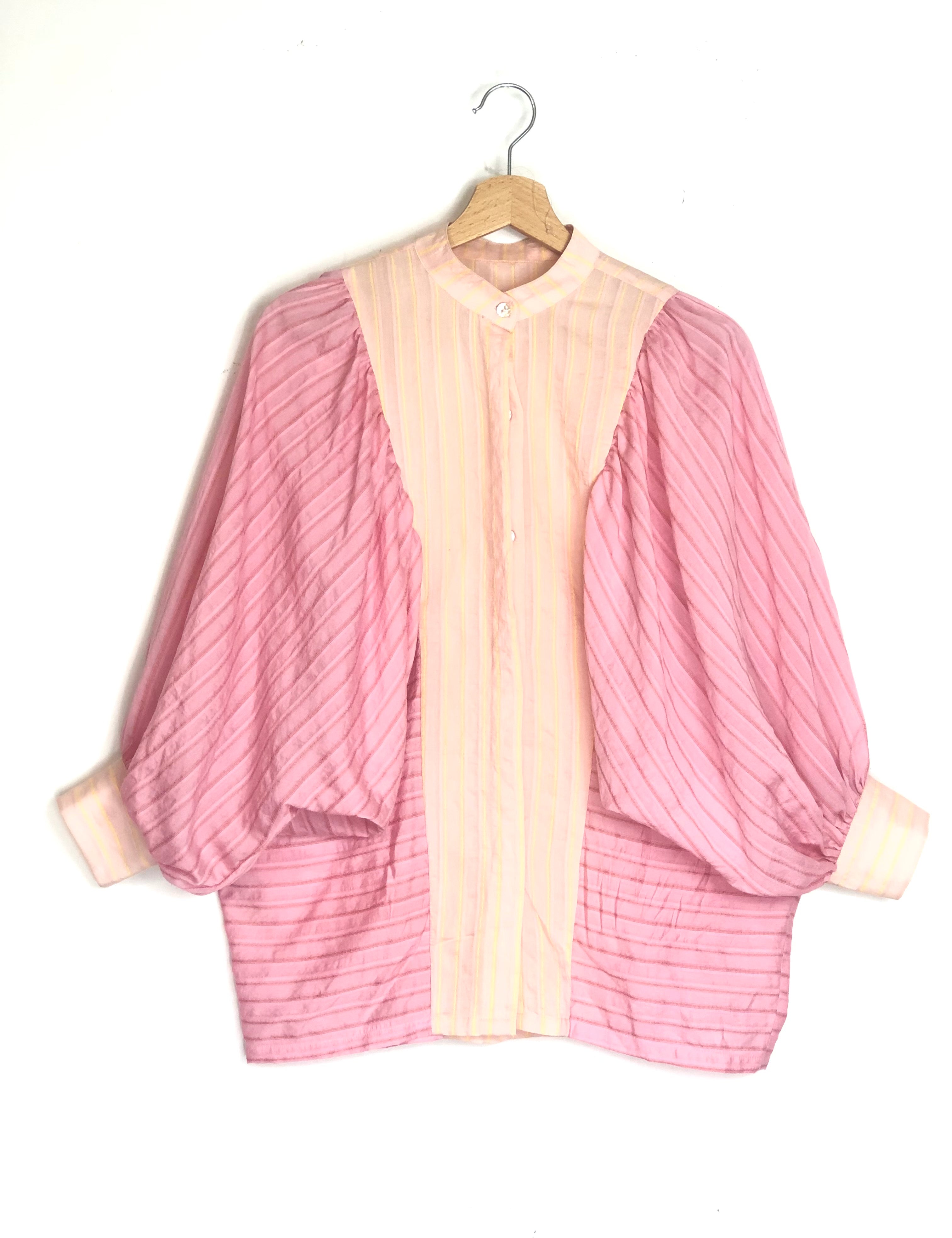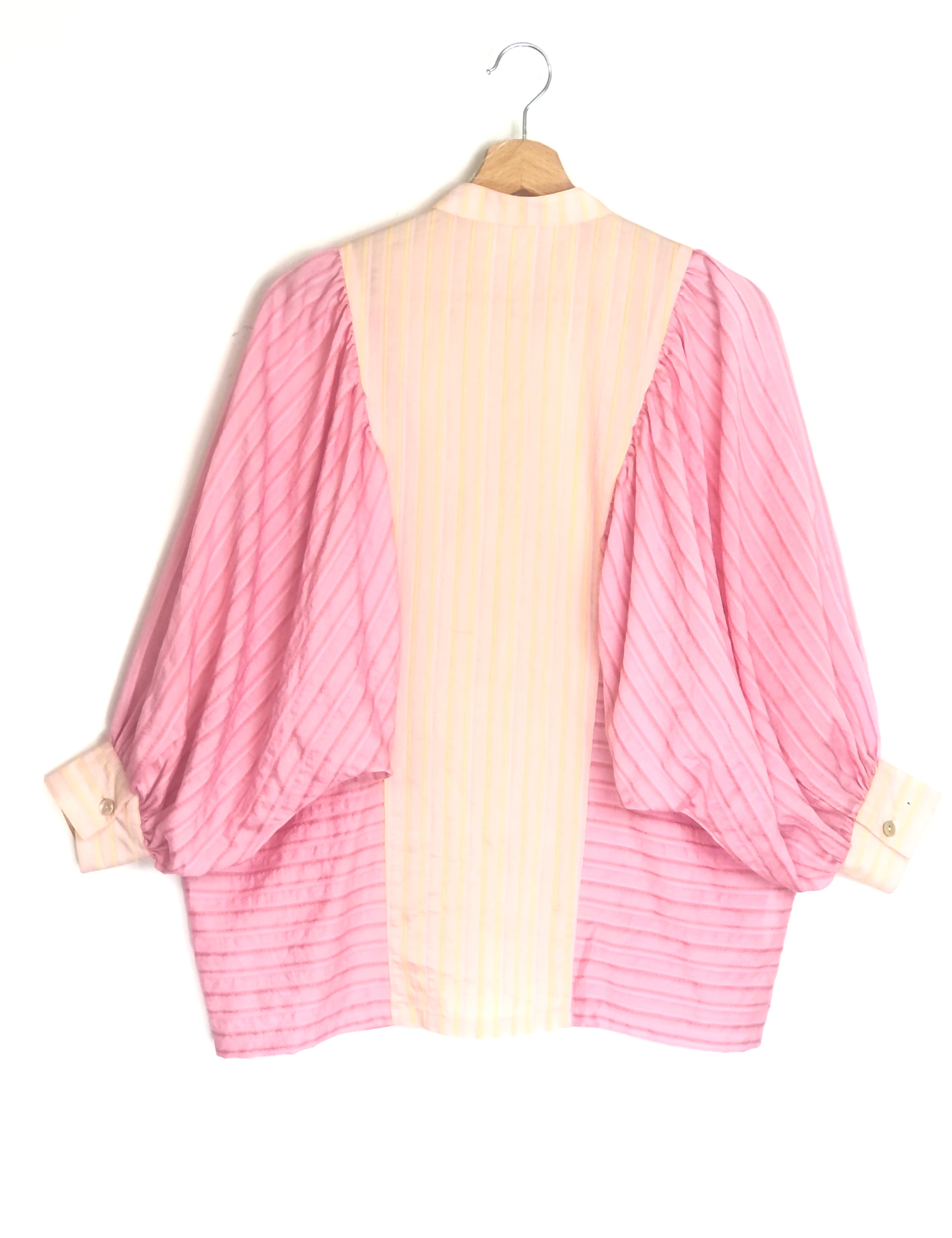 Pink and Yellow Striped Puffed Sleeves Cotton Blouse / BY MARY - Size S