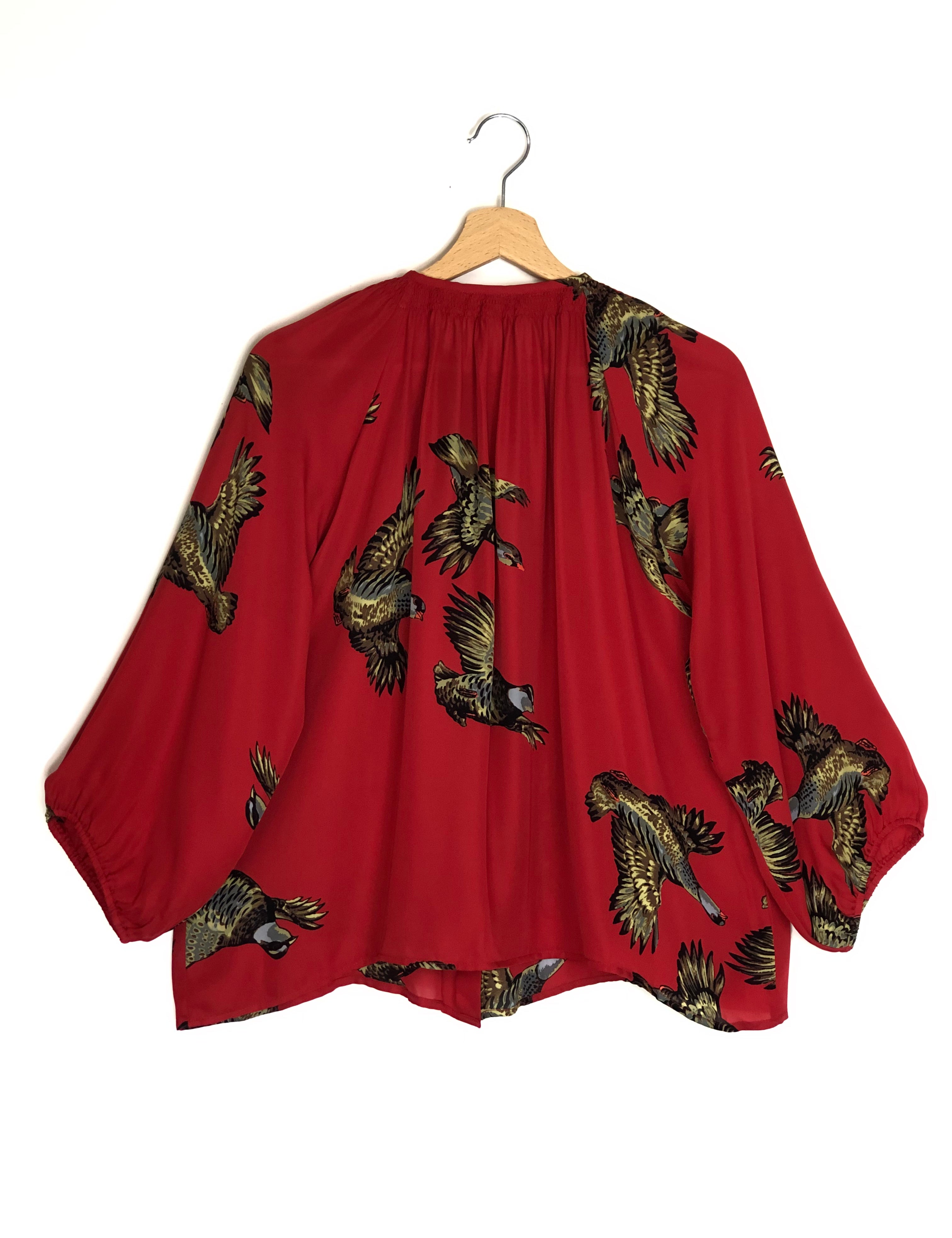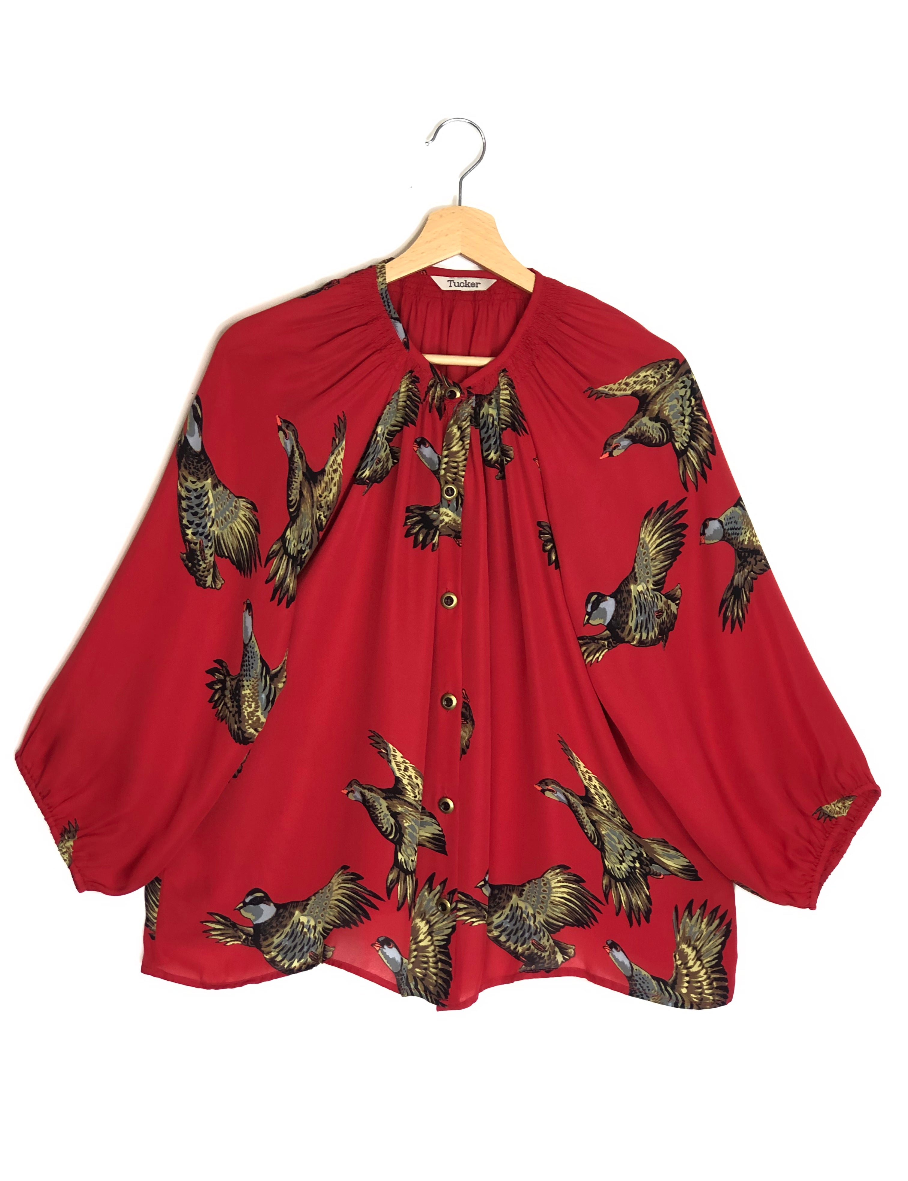 Red Pheasant Print Silk Blouse / TUCKER - Size S