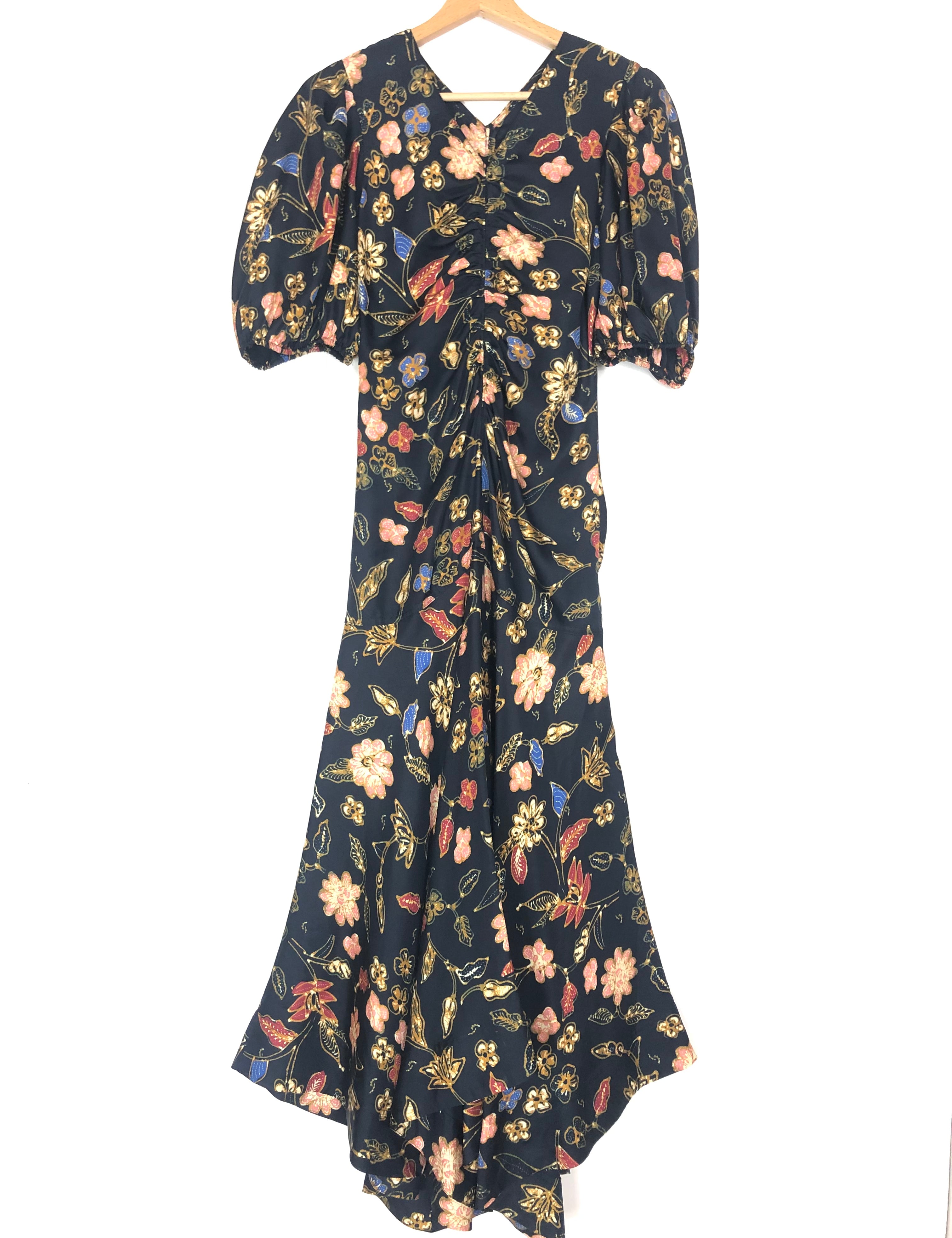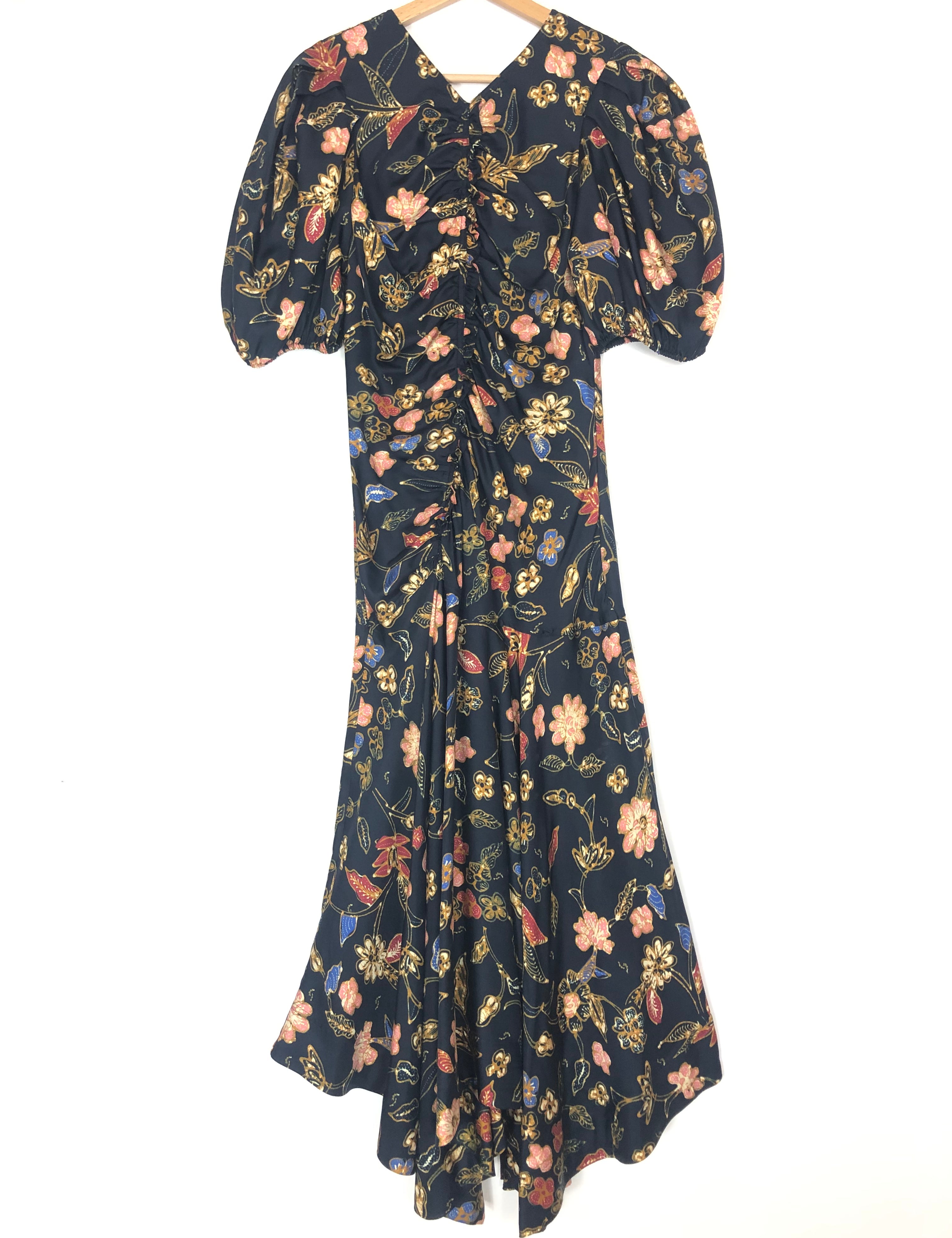Dark Navy HELEEN Floral Printed Silk Puff-sleeve Maxi Dress / ULLA JOHNSON - Size US 6
