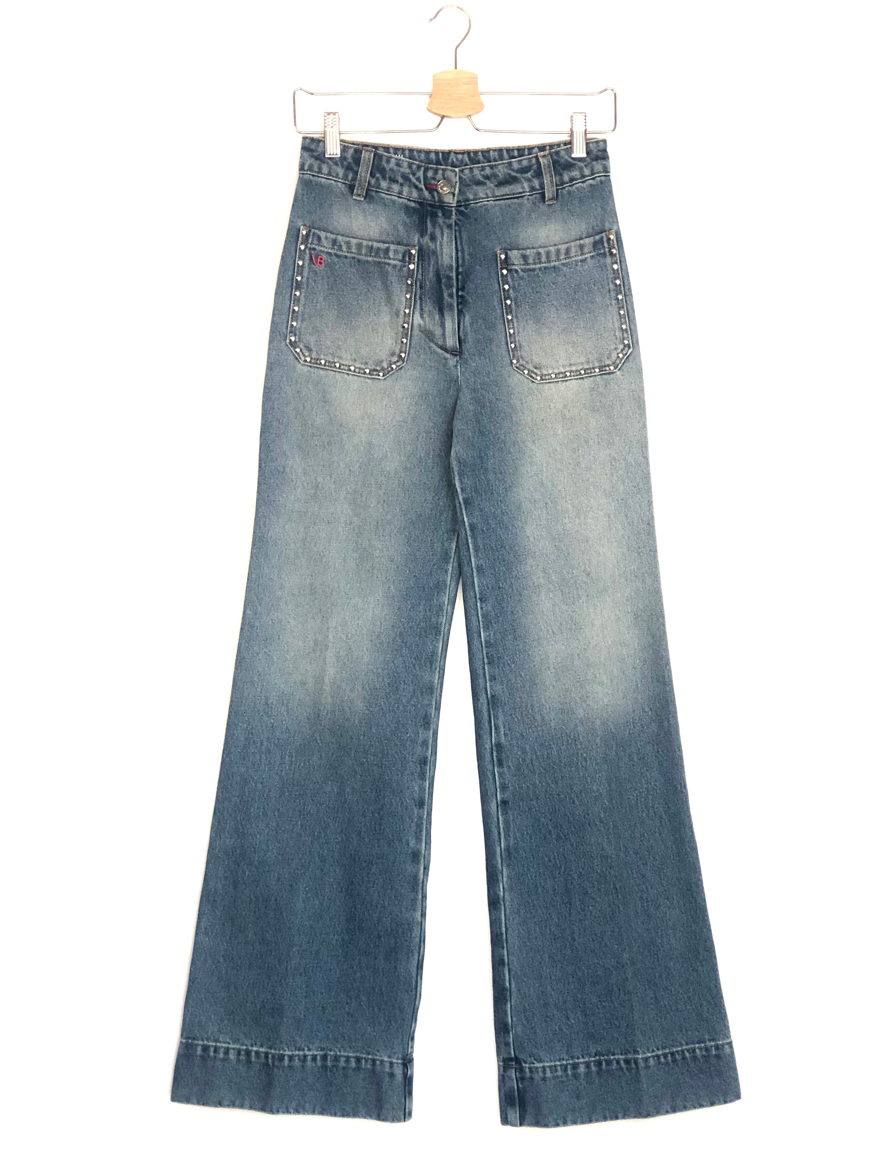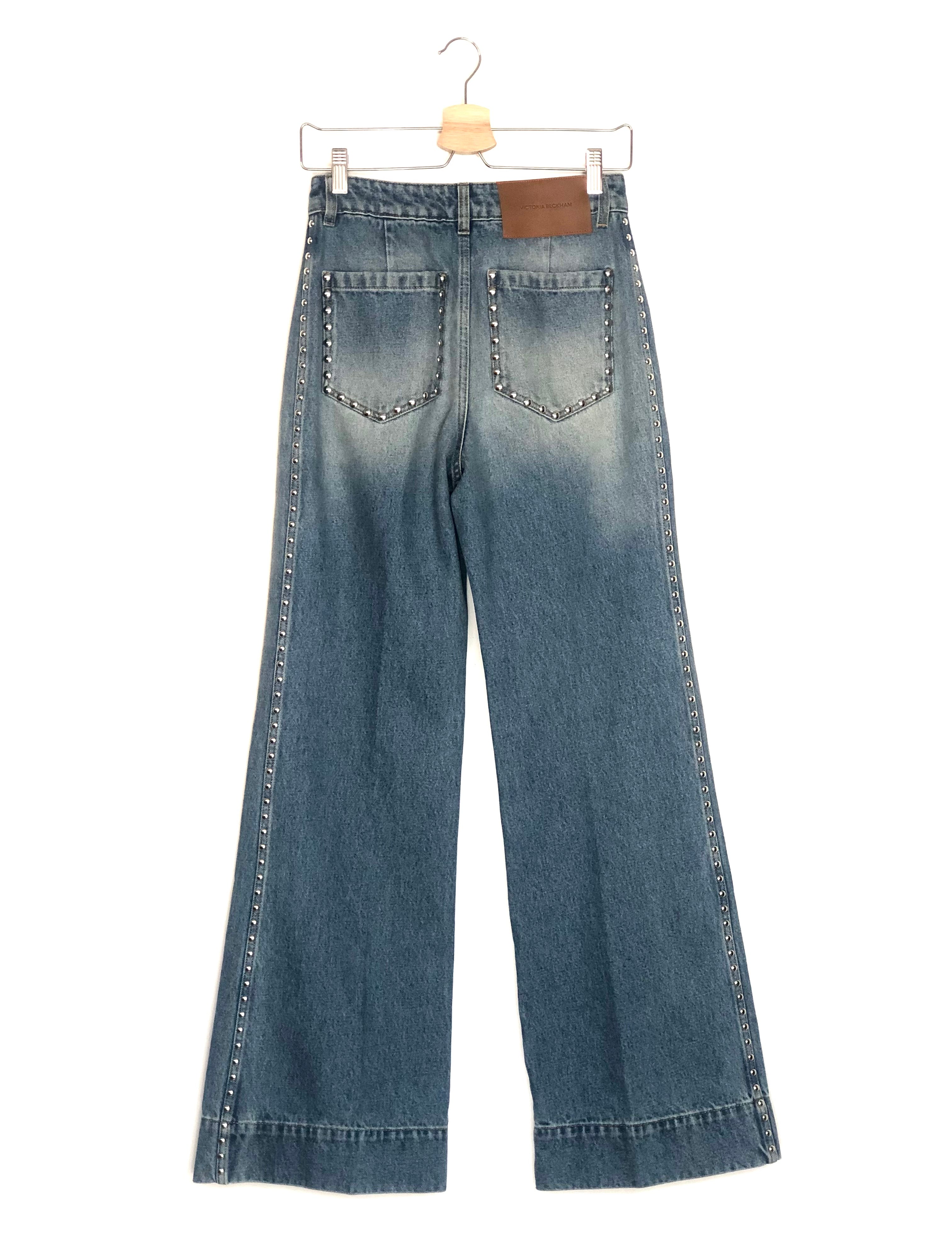 Blue Denim ALINA Studs Embellished High-rise Wide-leg Jeans / VICTORIA BECKHAM - Size 26