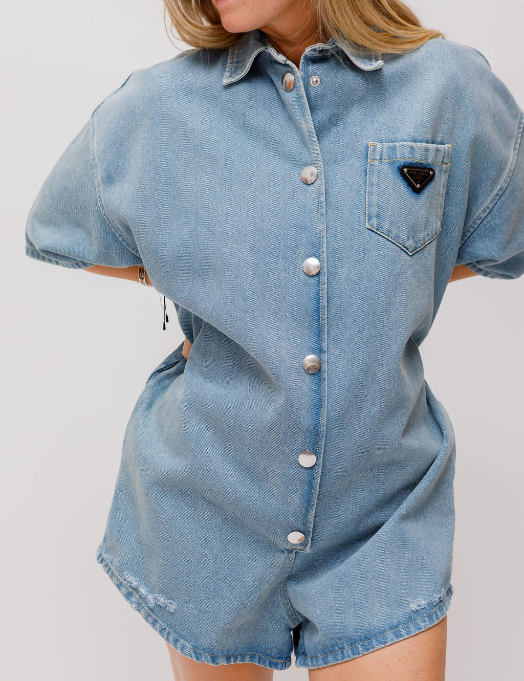 Blue Washed Logo-embossed Denim Playsuit / PRADA - Size 40 IT