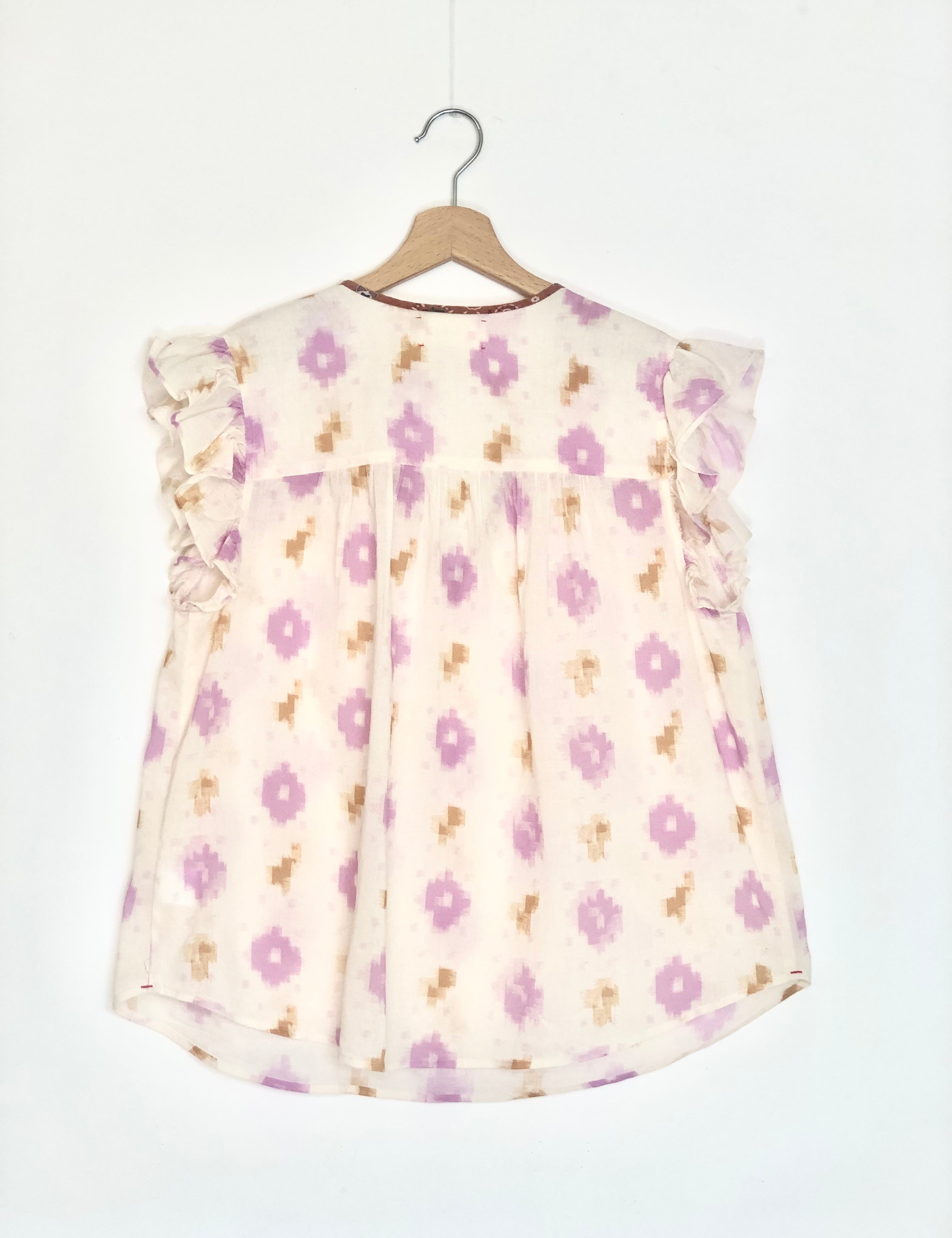 Lilac BRENN Ikat Print Cotton Gauze Ruffled Sleeveless Blouse / XIRENA - Size S