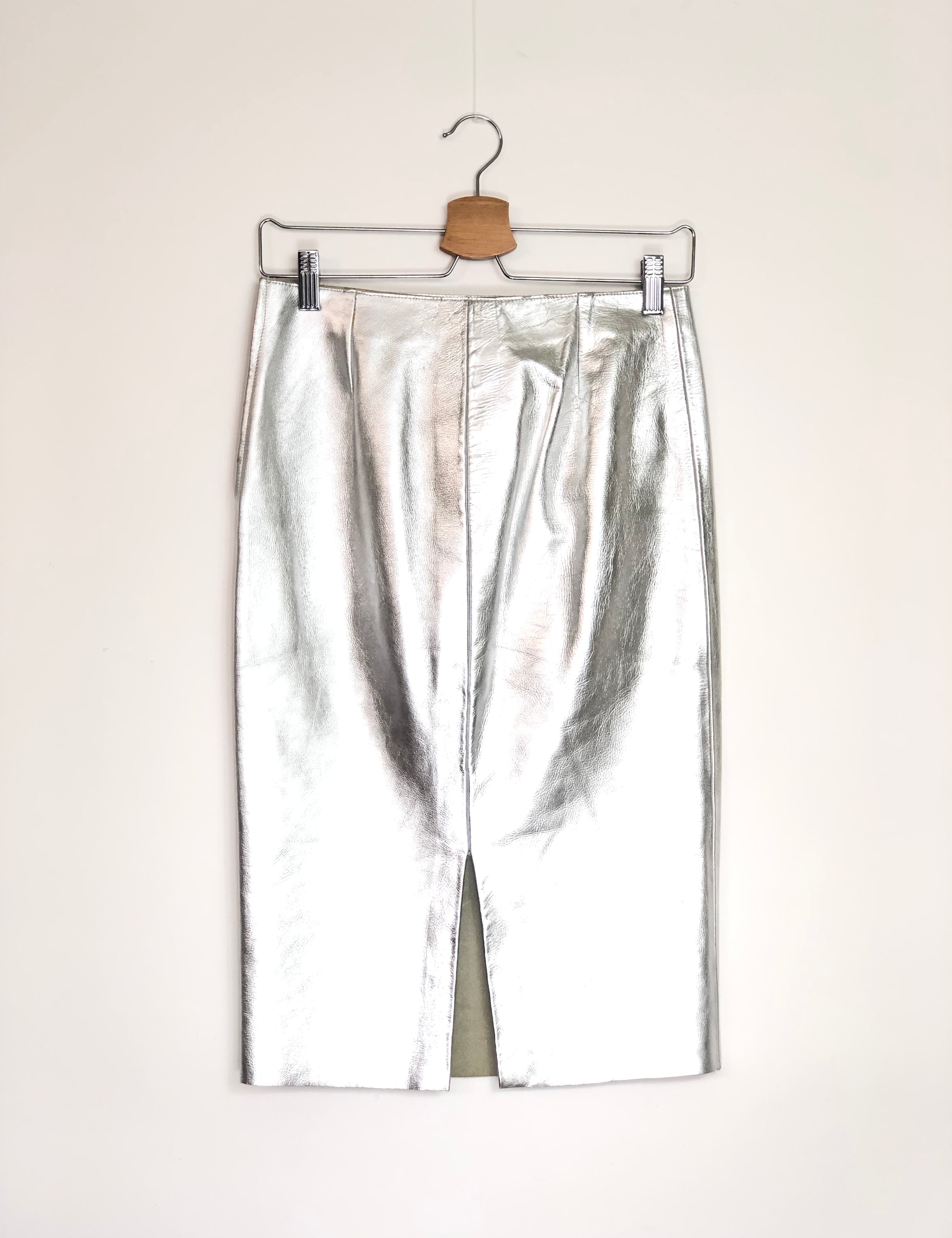 Silver GALLIUM Calfskin Leather Pencil Skirt / MAJE - Size 34