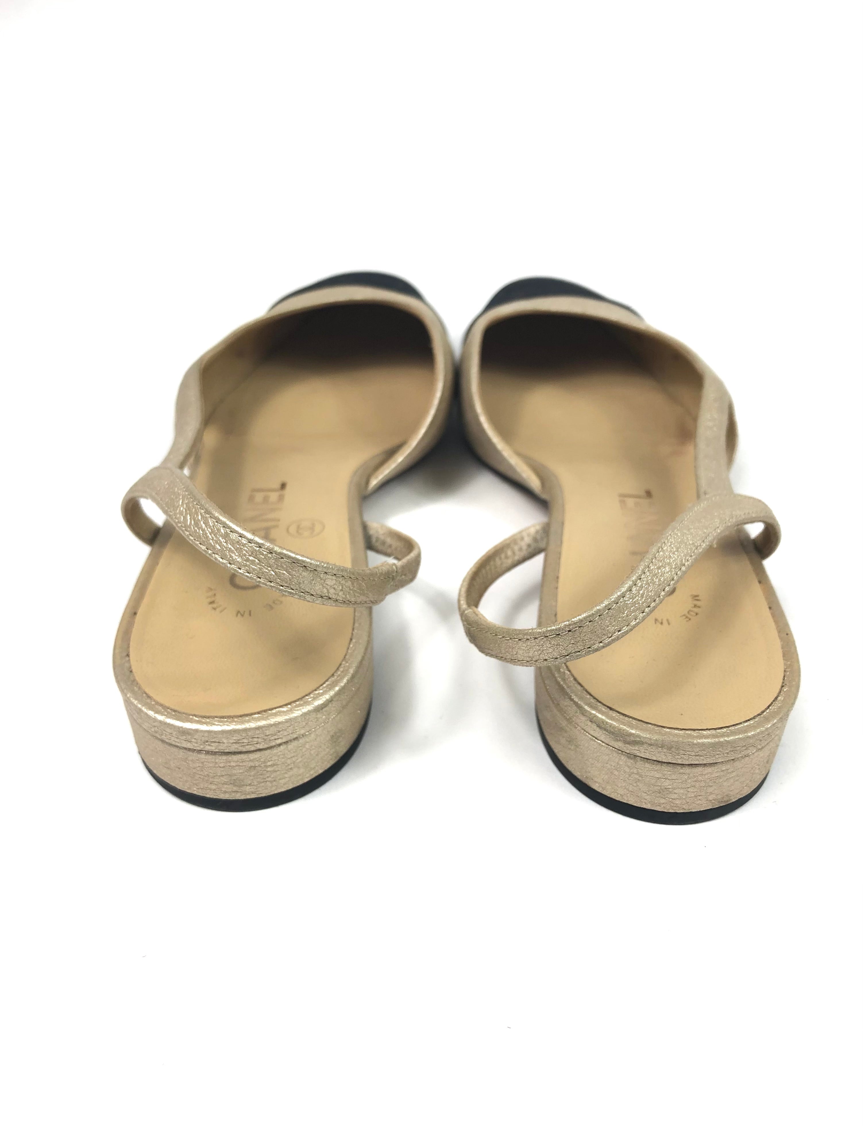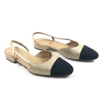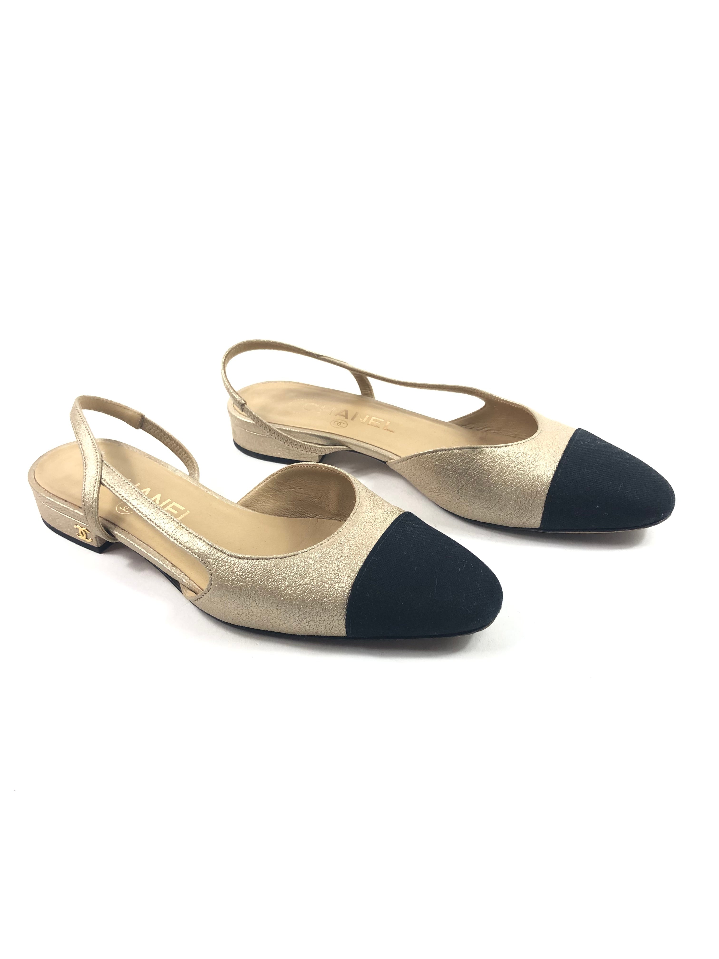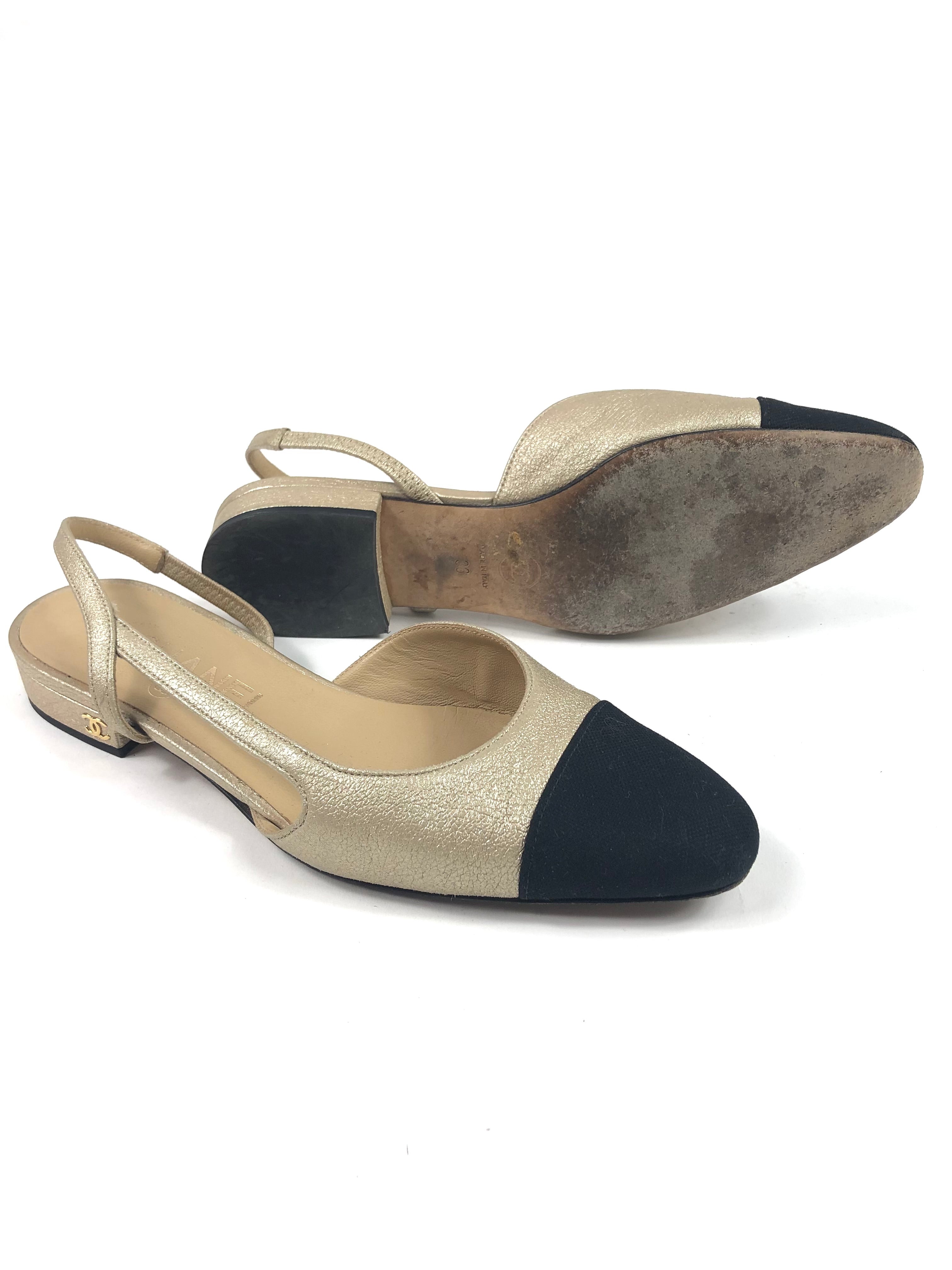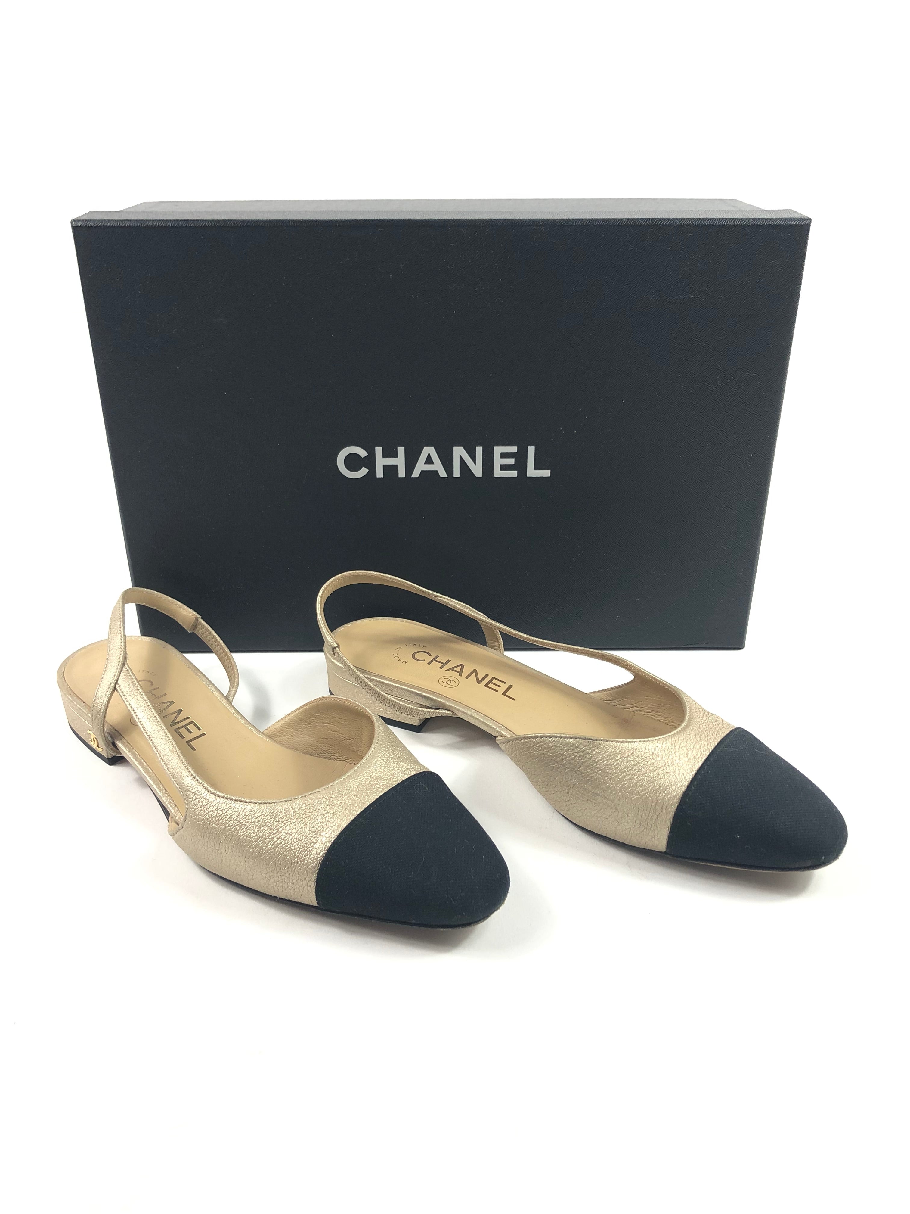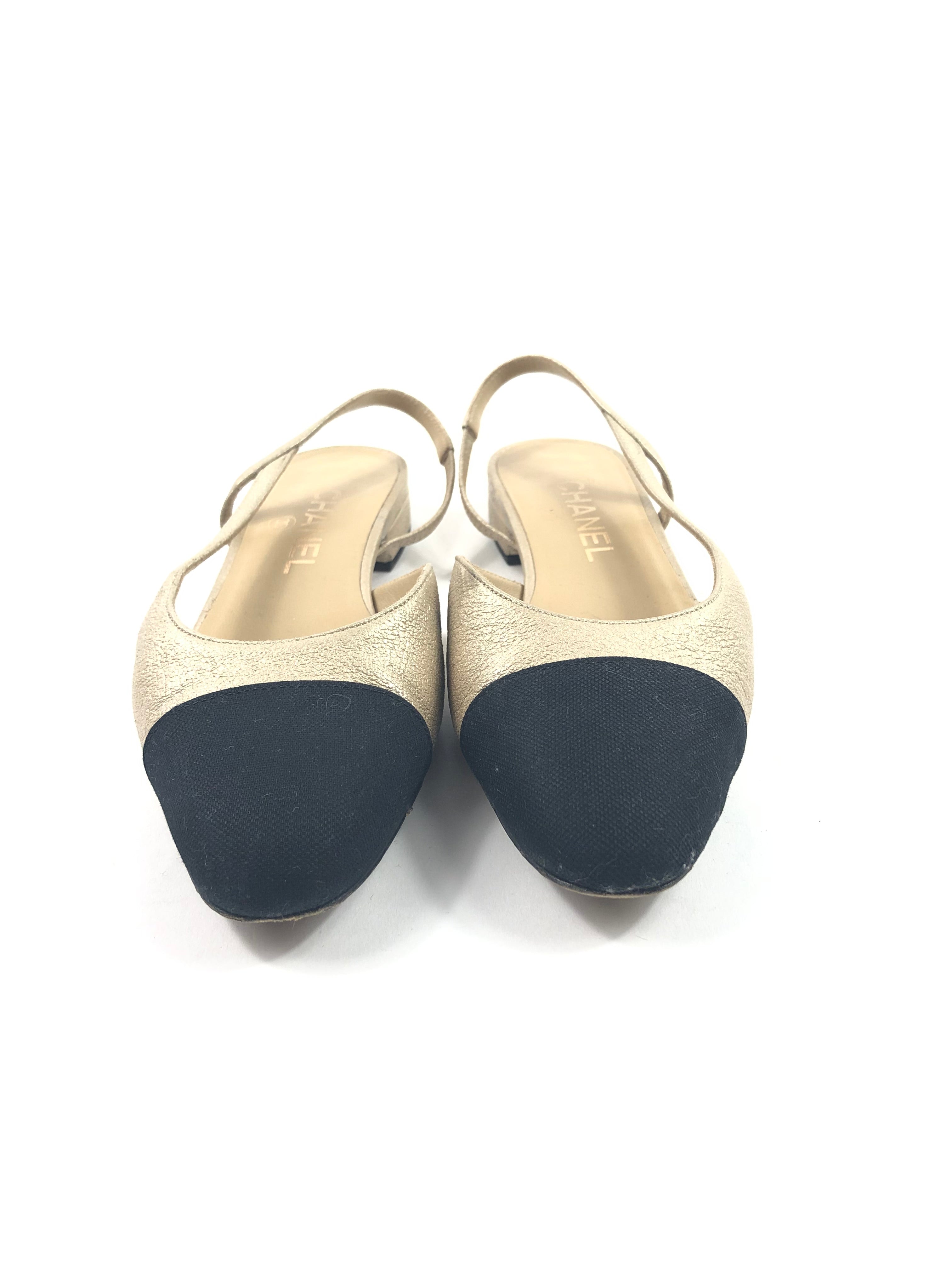 Beige Metallic Leather and Black Fabric Cap Toe Slingback Pumps / CHANEL - Size 36