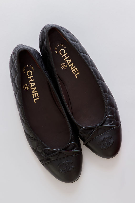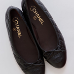 Black Aged Calfskin Quilted CC Toe Cap Ballet Flats / CHANEL - Size 37C