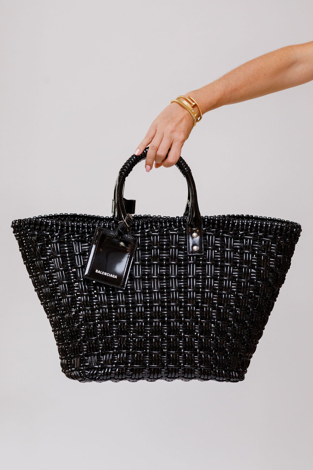 The Bistro Basket bag by Balenciaga might be your next trusted, sleek black sidekick. Made from varnished faux calfskin, it's completed with dual handles, a removable shoulder strap, an inner zip pocket, and a removable luggage tag with a logo.