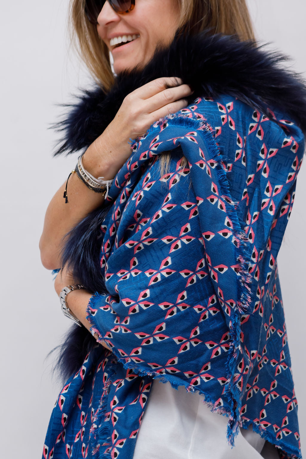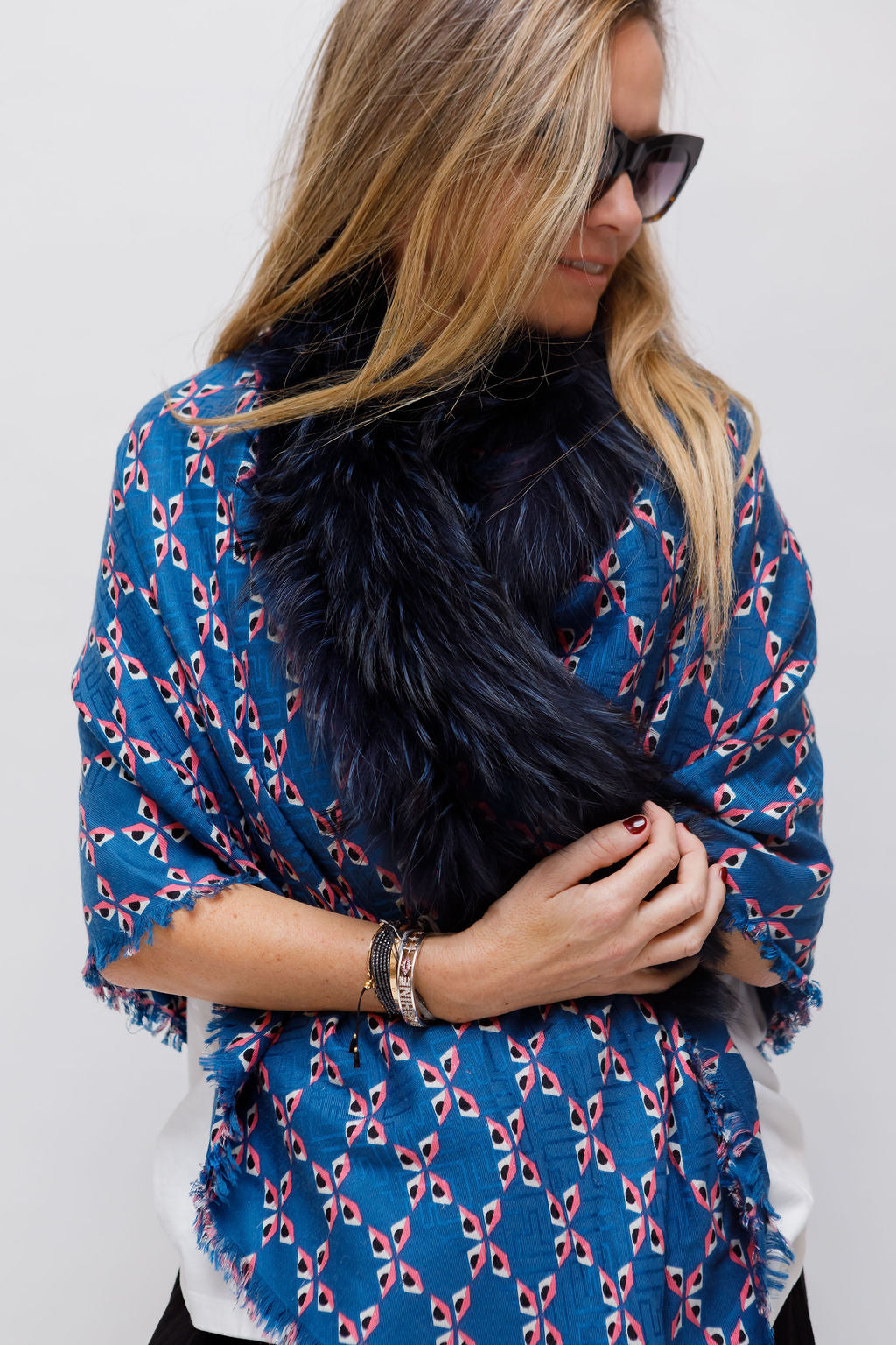 Blue Printed Touch of Fur Silk and Wool Shawl / FENDI
