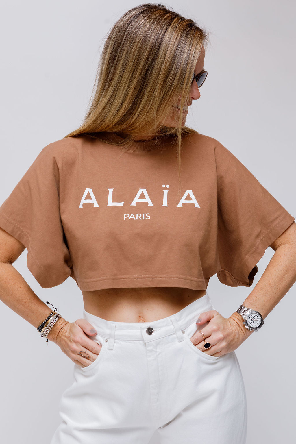 Brown Logo Wide Sleeves Jersey Cropped T-shirt / ALAIA - Size 42
