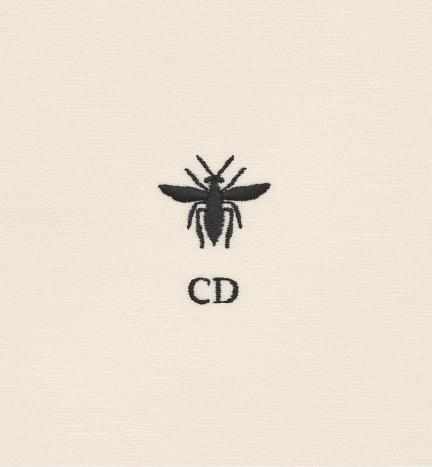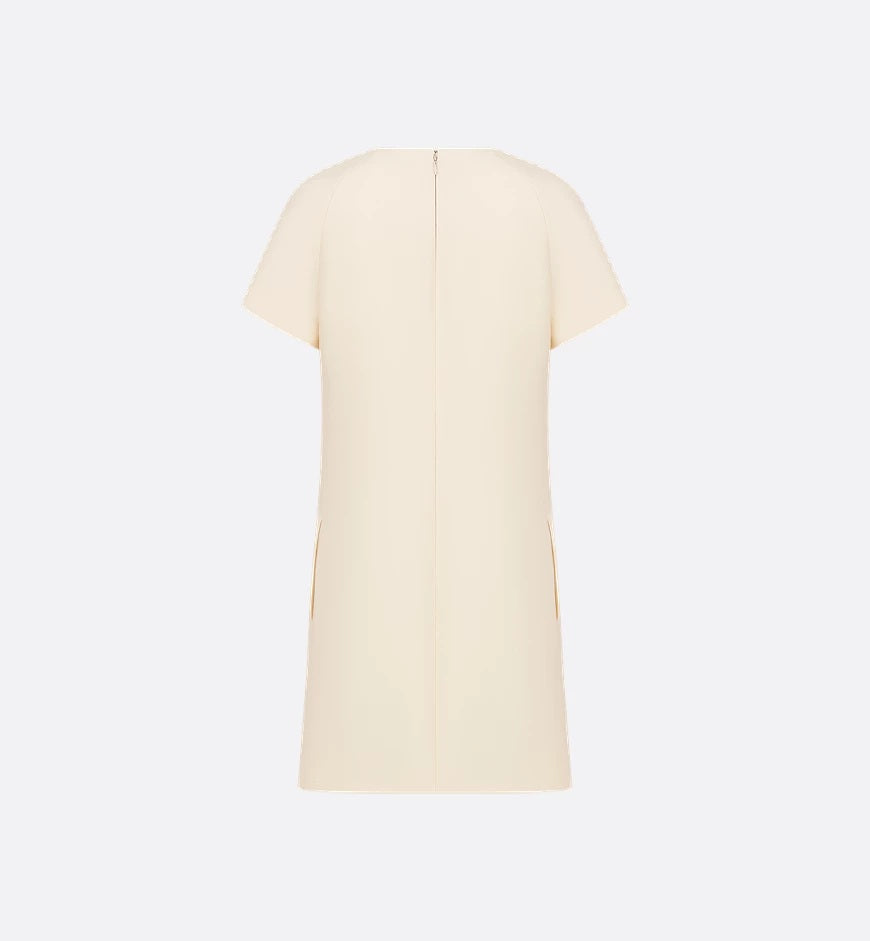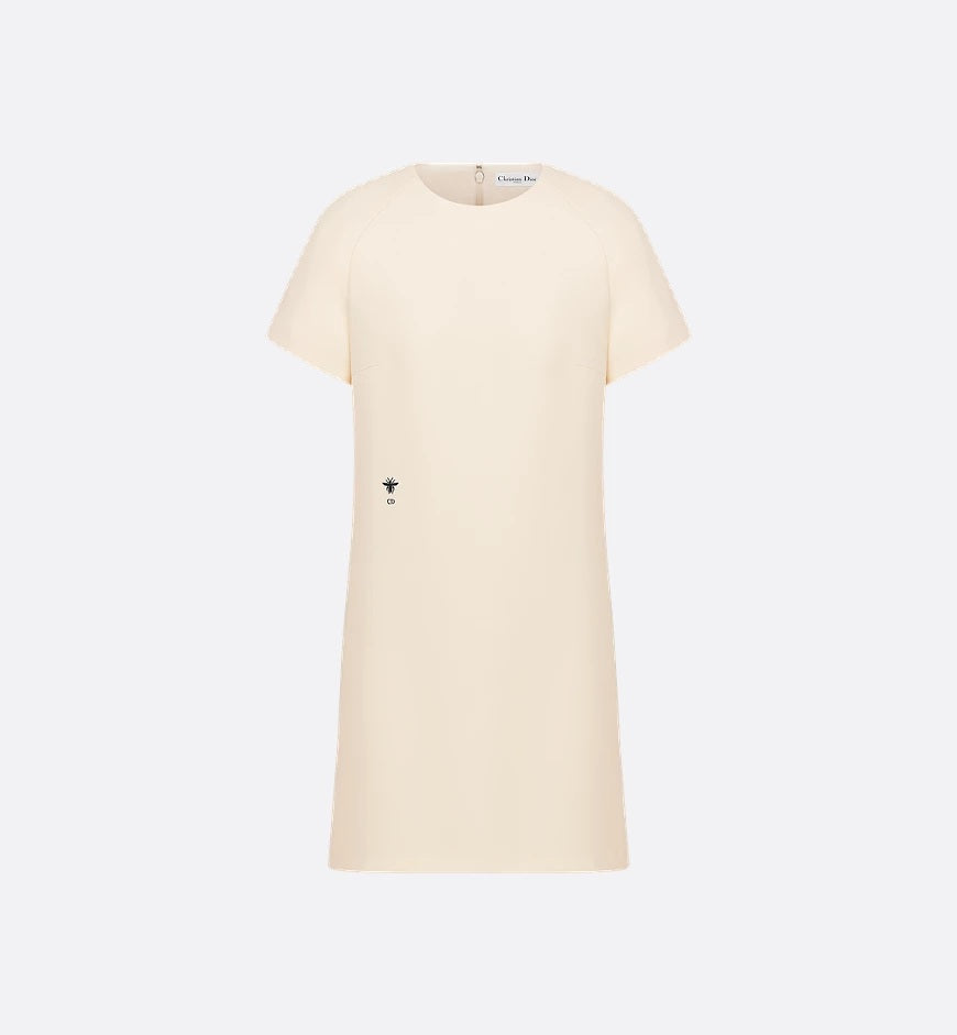 This modern yet timeless dress is crafted from lightweight white wool and silk, featuring a straight silhouette with side slit pockets, short sleeves, and a round neckline. The embroidered hallmark bee and CD signature add a touch of elegance. Perfect for versatile styling, this dress offers effortless sophistication.