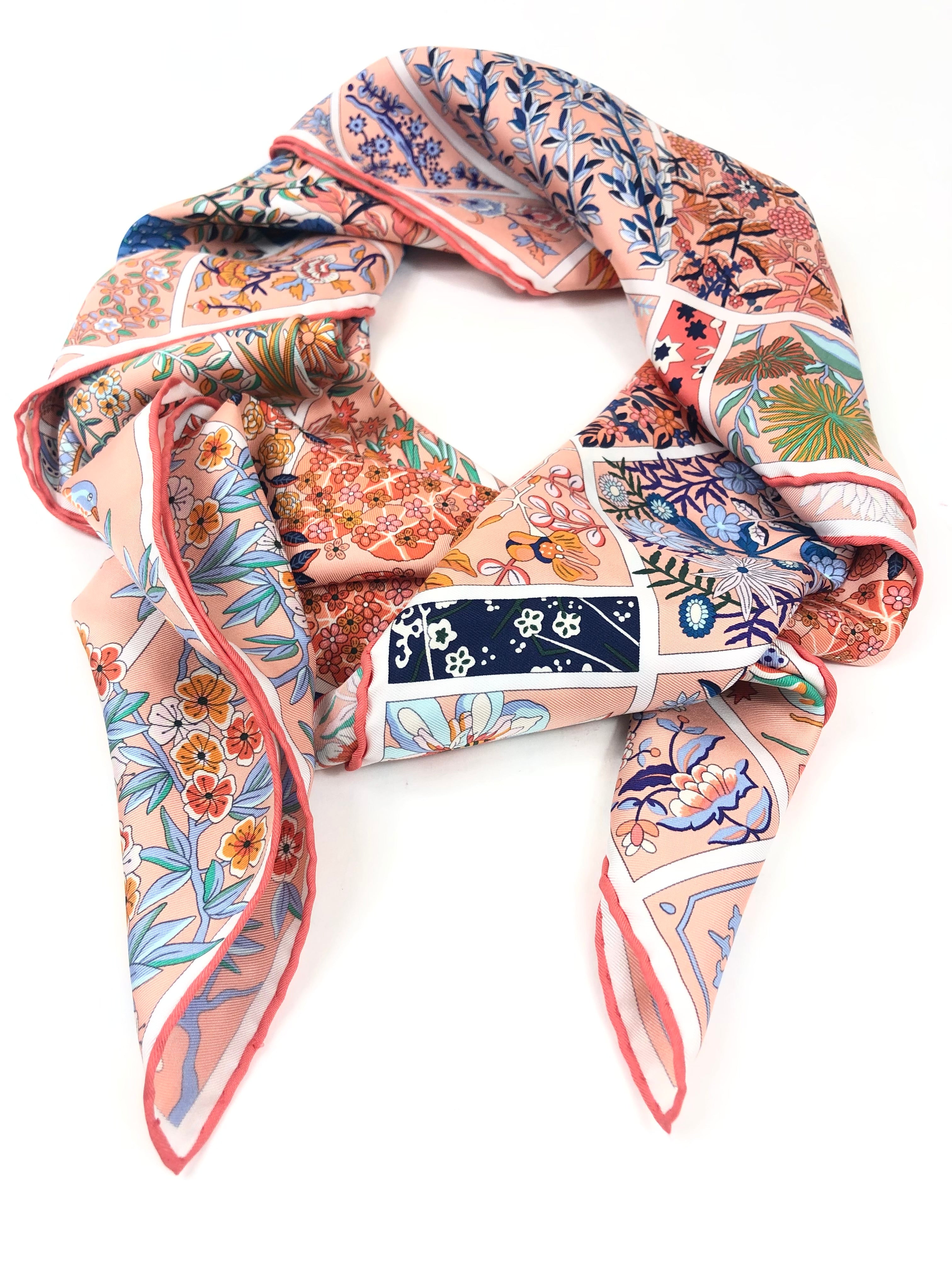 Coral Orange FLEURS DE GIVERNY Carre Twill 90 Silk Scarf / HERMES