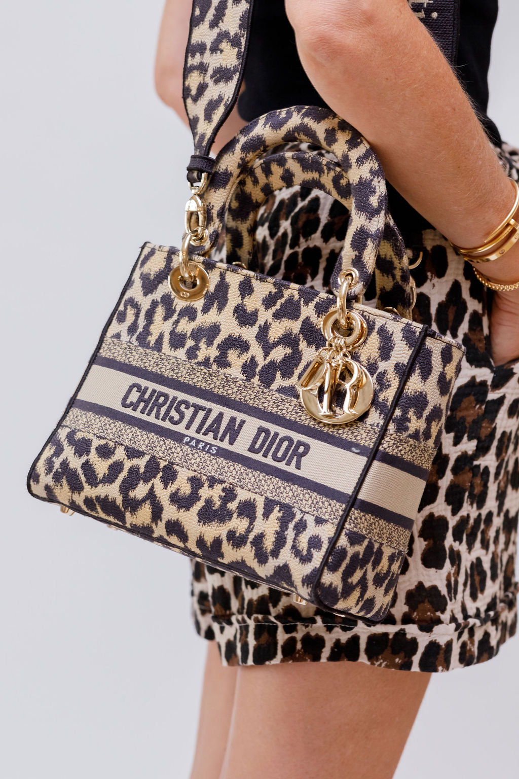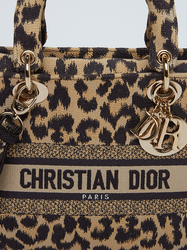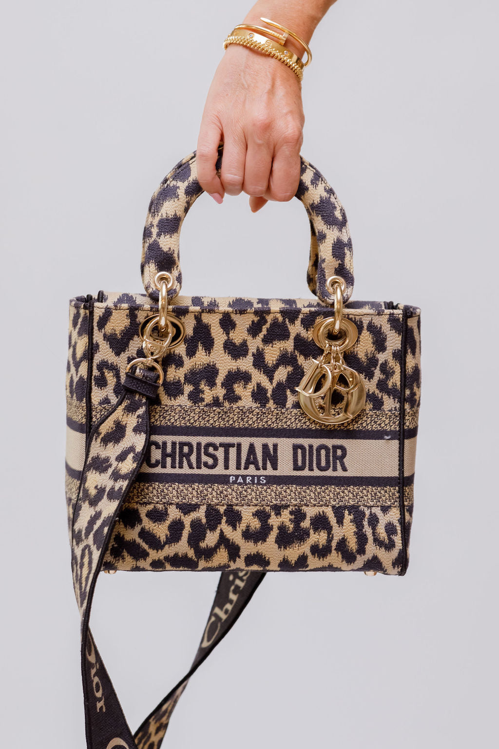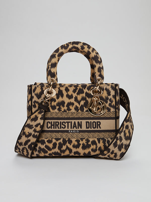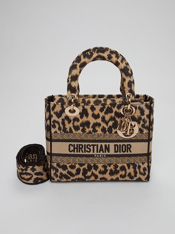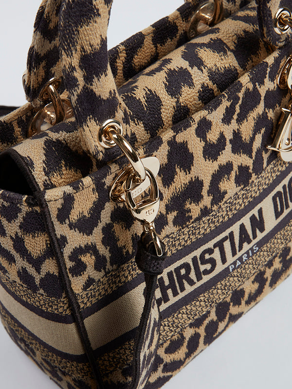 The Lady D-Lite bag combines classic elegance with House modernity. The style is fully embroidered with a beige multicolor Mizza motif, inspired by a leopard pattern from the House archives. The front features a 'CHRISTIAN DIOR PARIS' signature while the thick 'D.I.O.R.' charms in pale gold-finish metal further enhance the silhouette. Equipped with a wide, reversible and removable embroidered shoulder strap, the medium Lady D-Lite bag can be carried by hand or worn crossbody.