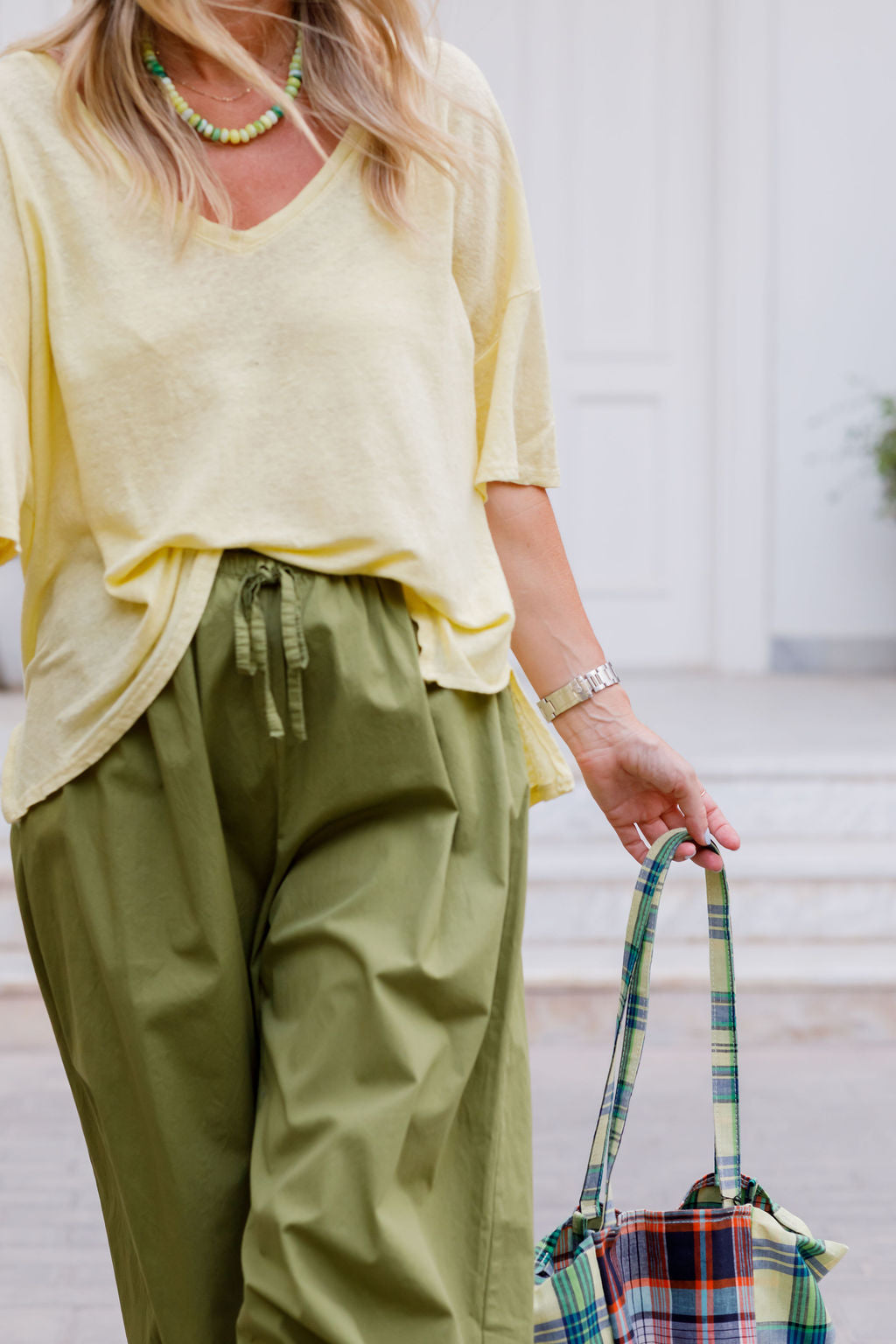 Light Yellow V-neck Oversized Linen Tee - One Size