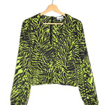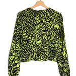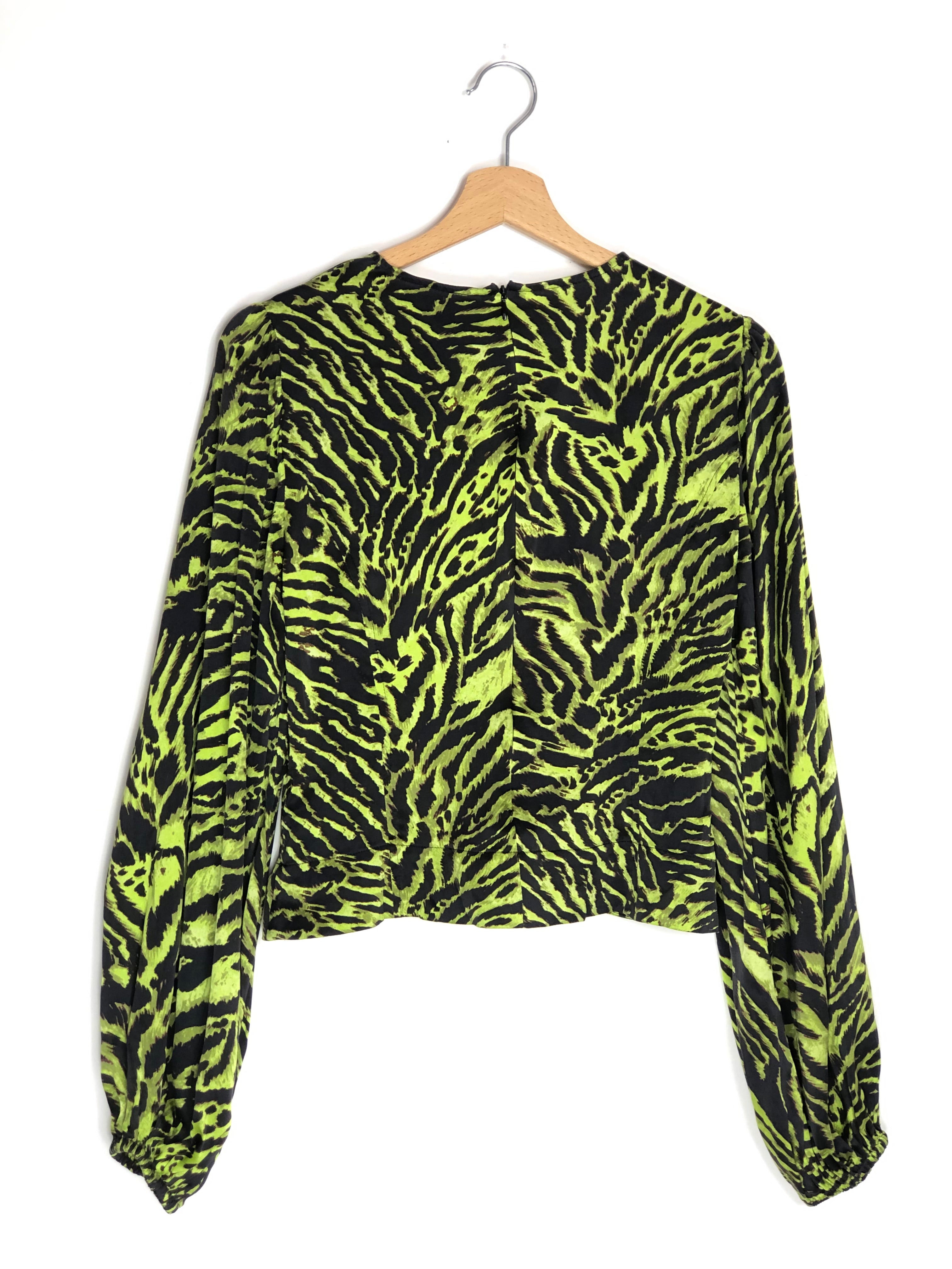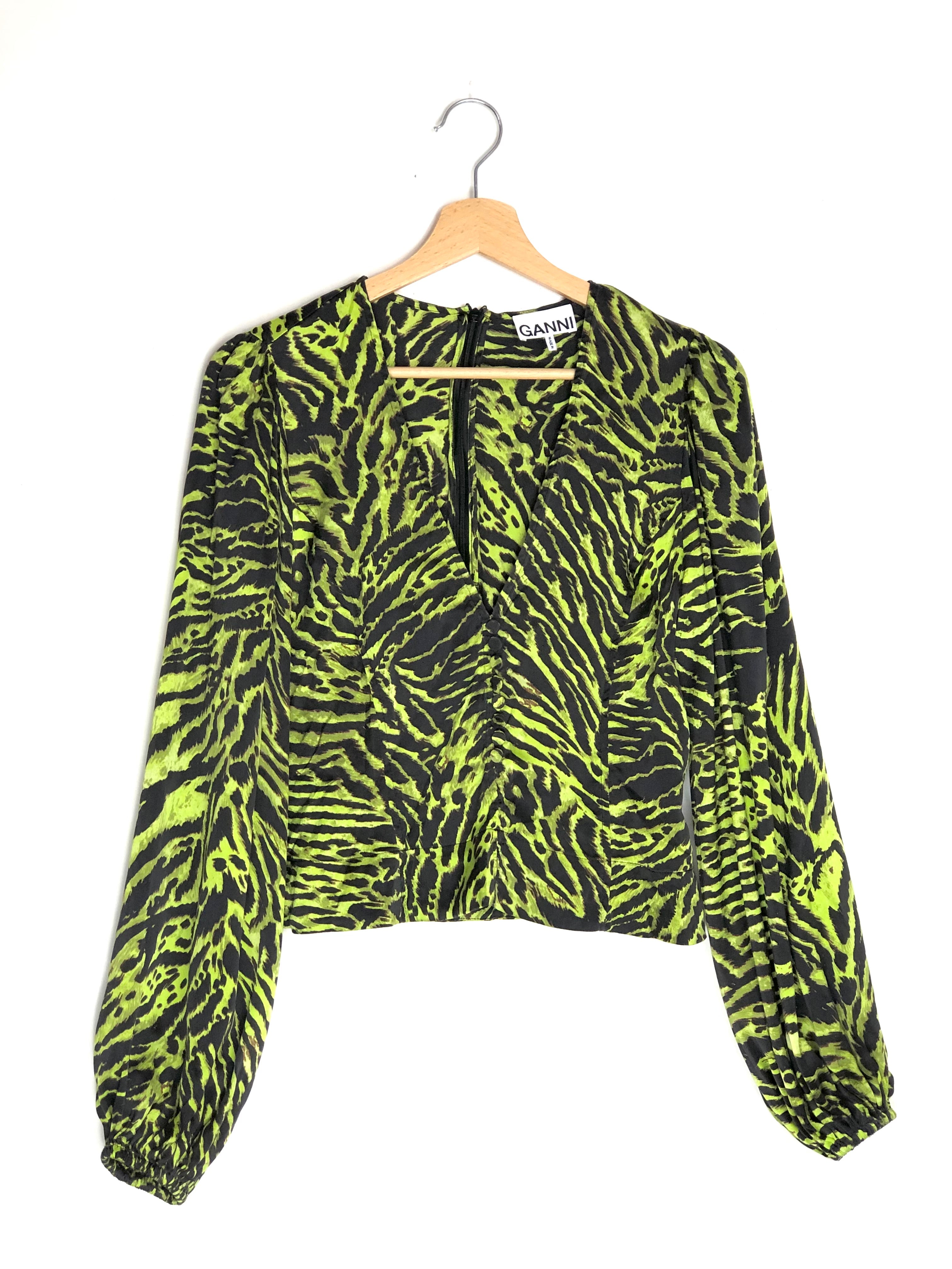 Lime Tiger Print Silk Stretch Puffed Long Sleeve Satin Blouse / GANNI - Size 36
