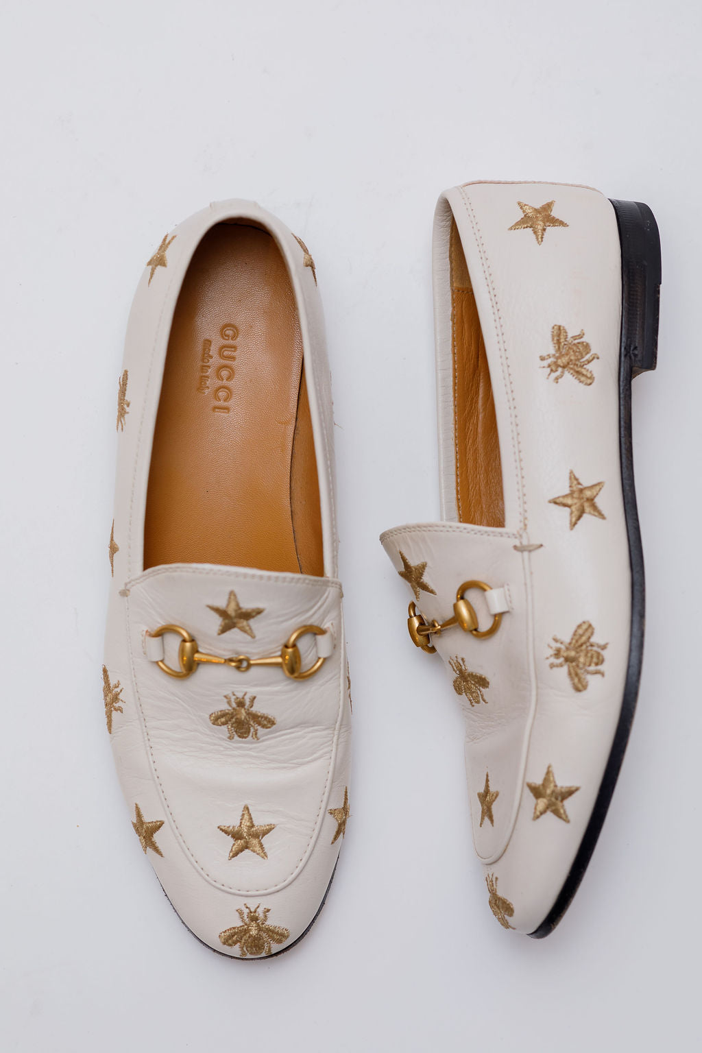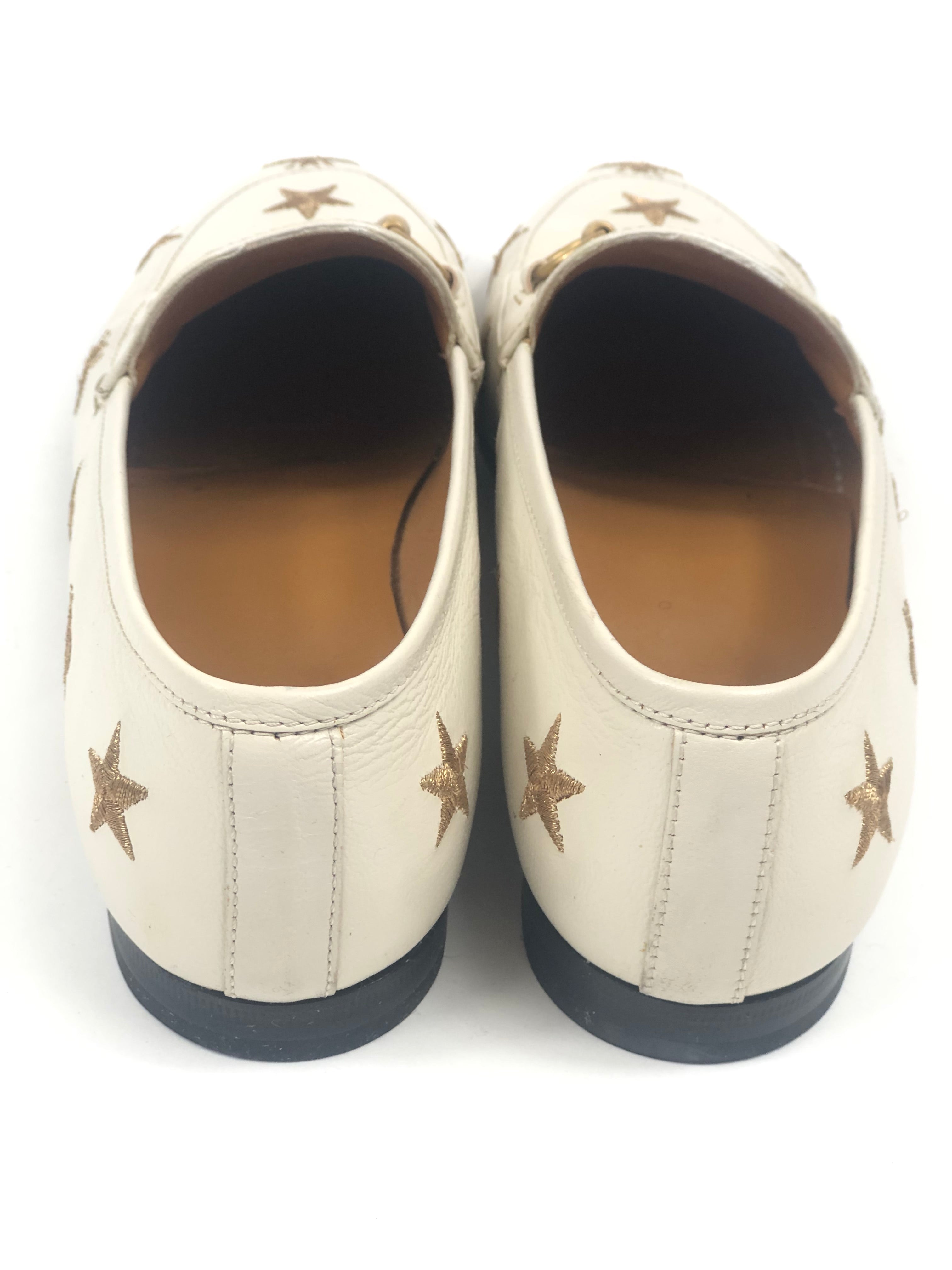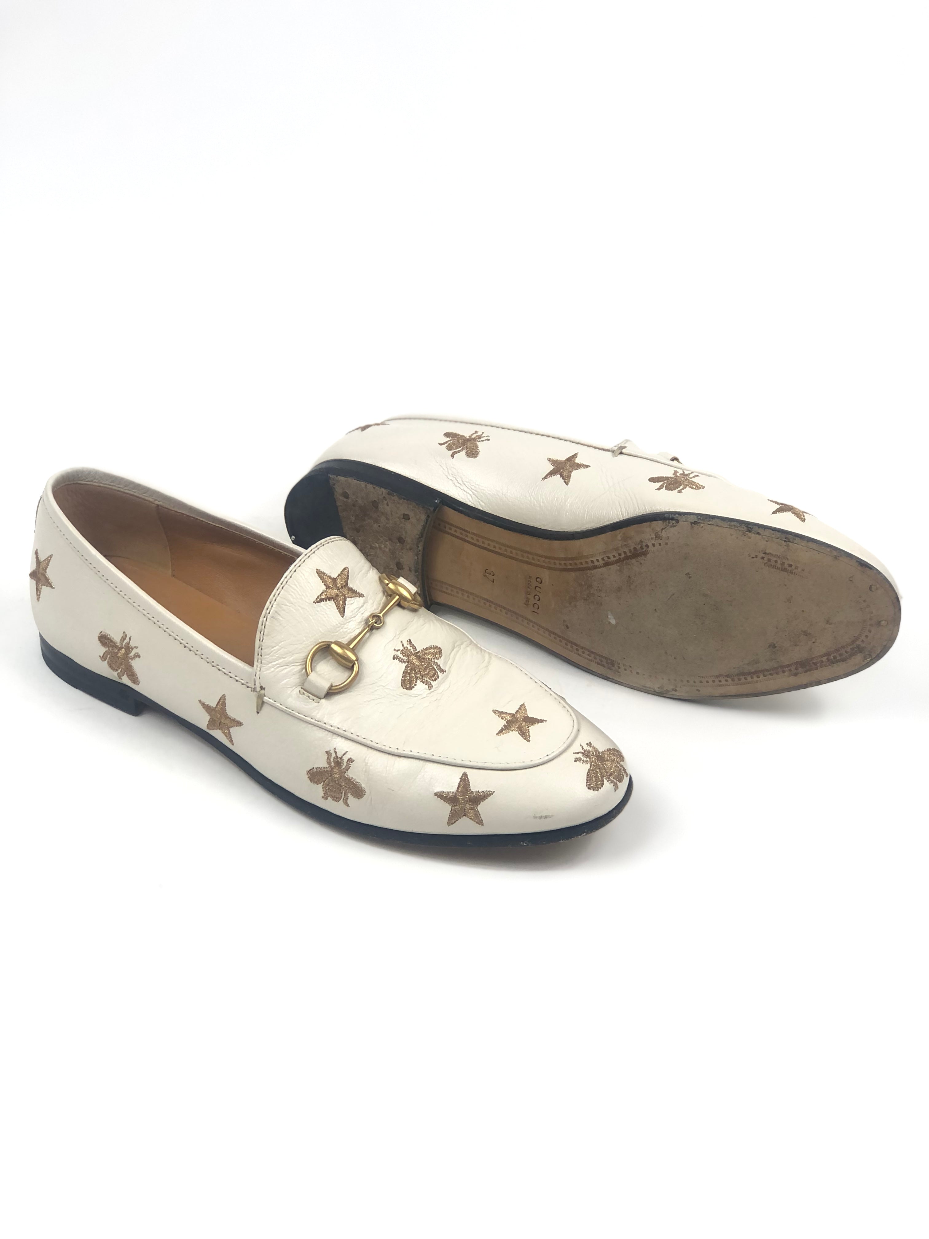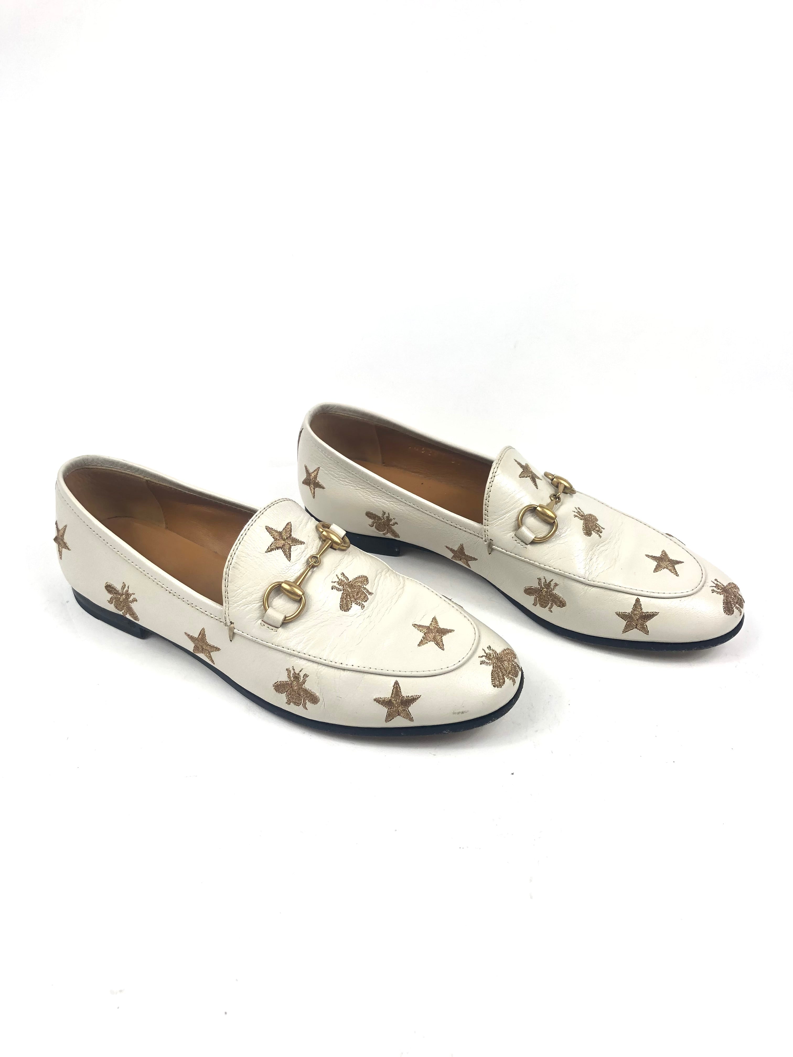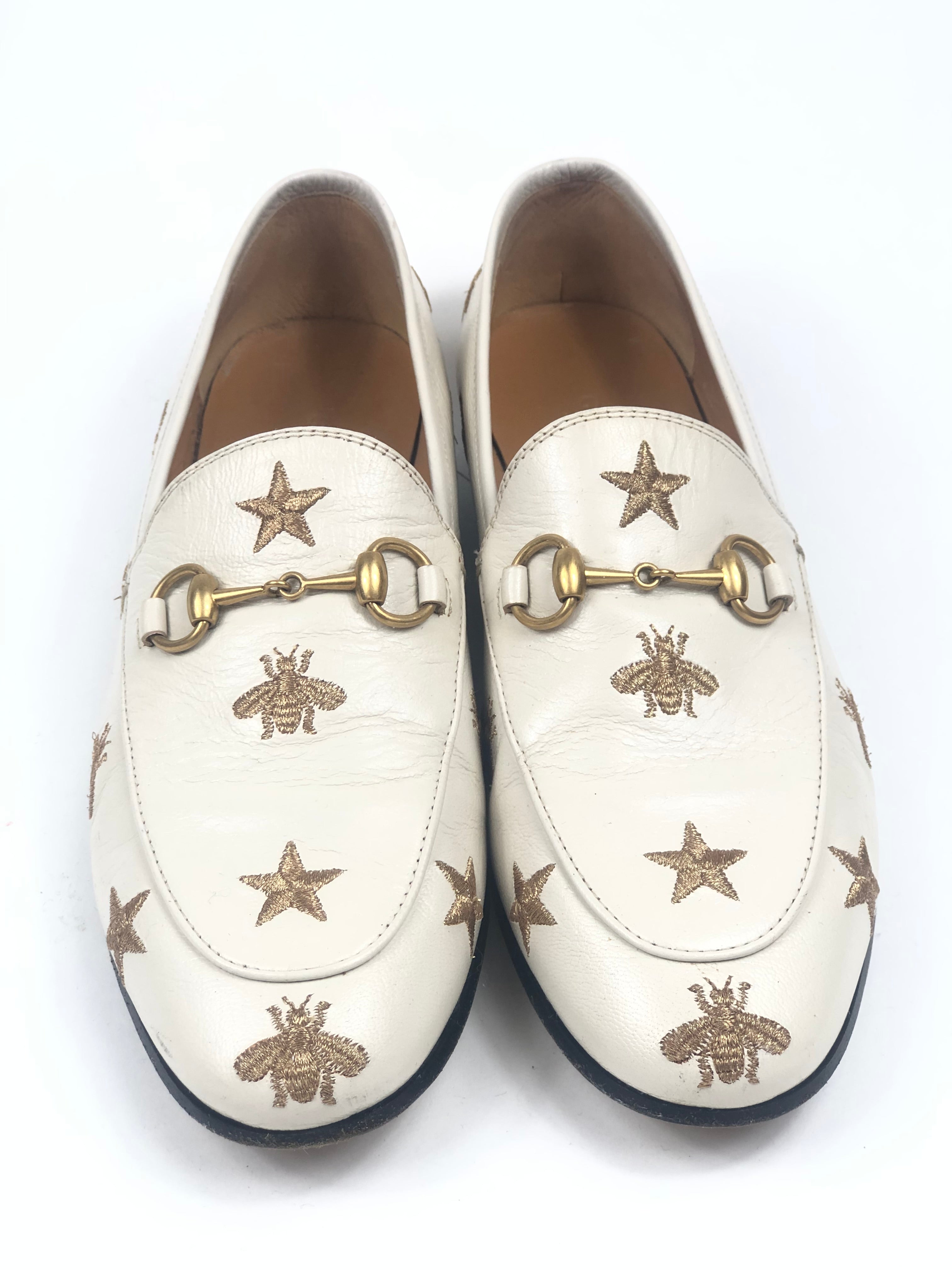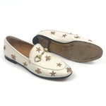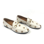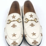 White JORDAAN Embroidered Bees and Stars Horsebit Leather Loafers / GUCCI - Size 37