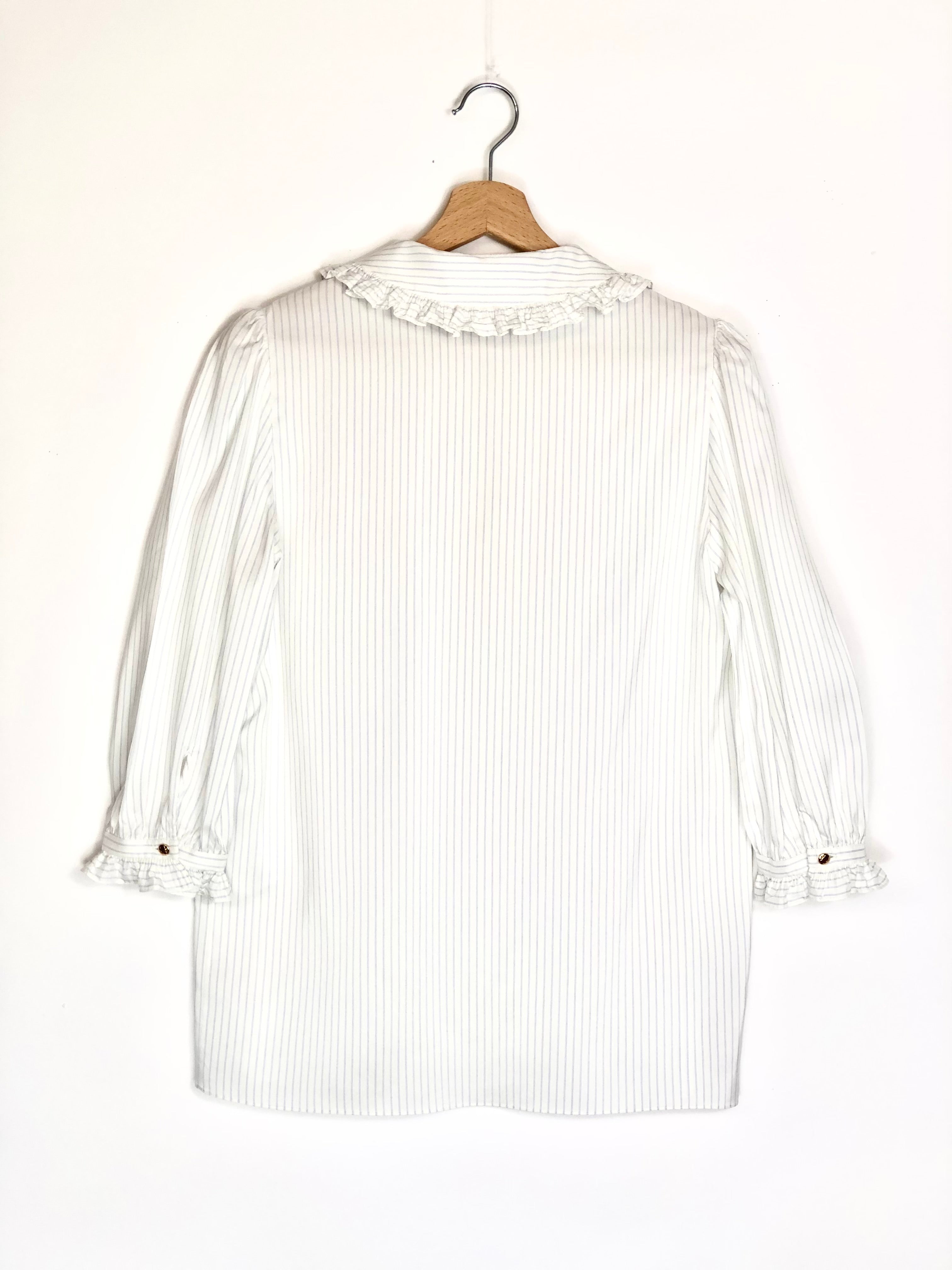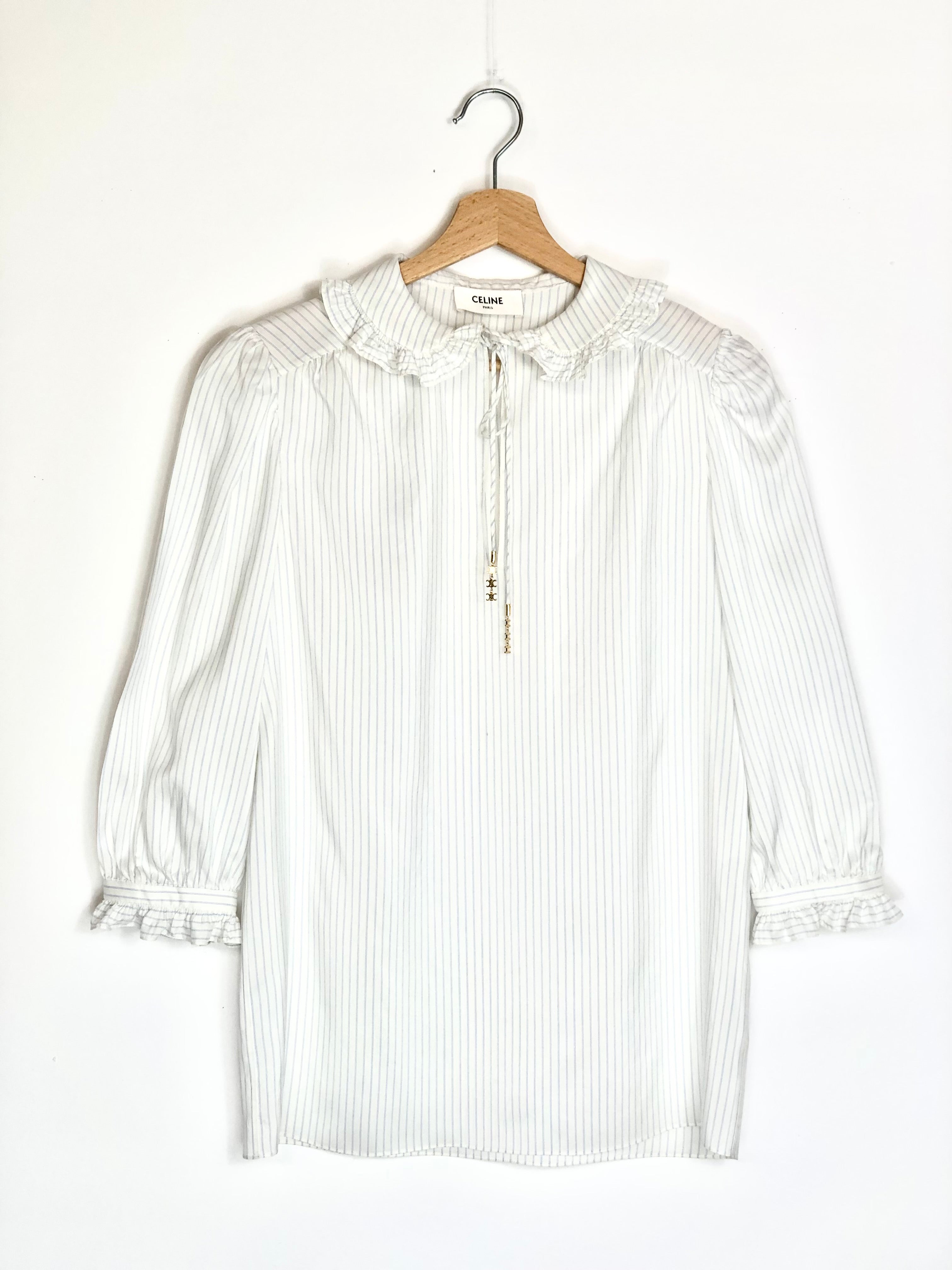 White Striped Ruffled Silk Long Sleeves Shirt / CELINE - Size 36